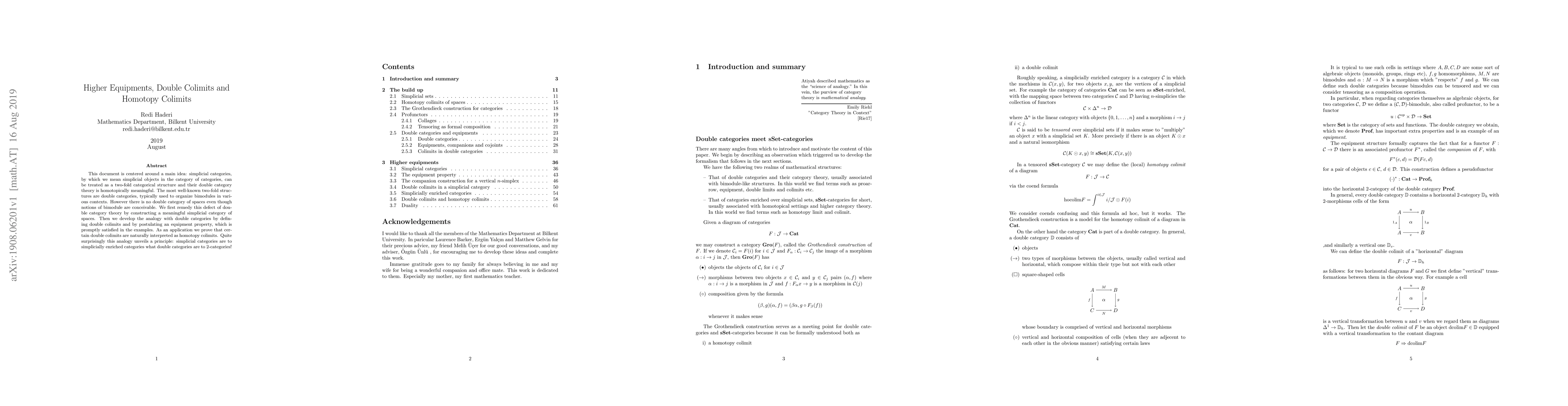 This document is centered around a main idea: simplicial categories, by which we mean simplicial objects in the category of categories, can be treated as a two-fold categorical structure and their double category theory is homotopically meaningful. The most well-known two-fold structures are double categories, typically used to organize bimodules in various contexts. However there is no double category of spaces even though notions of bimodule are conceivable. We first remedy this defect of double category theory by constructing a meaningful simplicial category of spaces. Then we develop the analogy with double categories by defining double colimits and by postulating an equipment property, which is promptly satisfied in the examples. As an application we prove that certain double colimits are naturally interpreted as homotopy colimits. Quite surprisingly this analogy unveils a principle: simplicial categories are to simplicially enriched categories what double categories are to 2-categories!