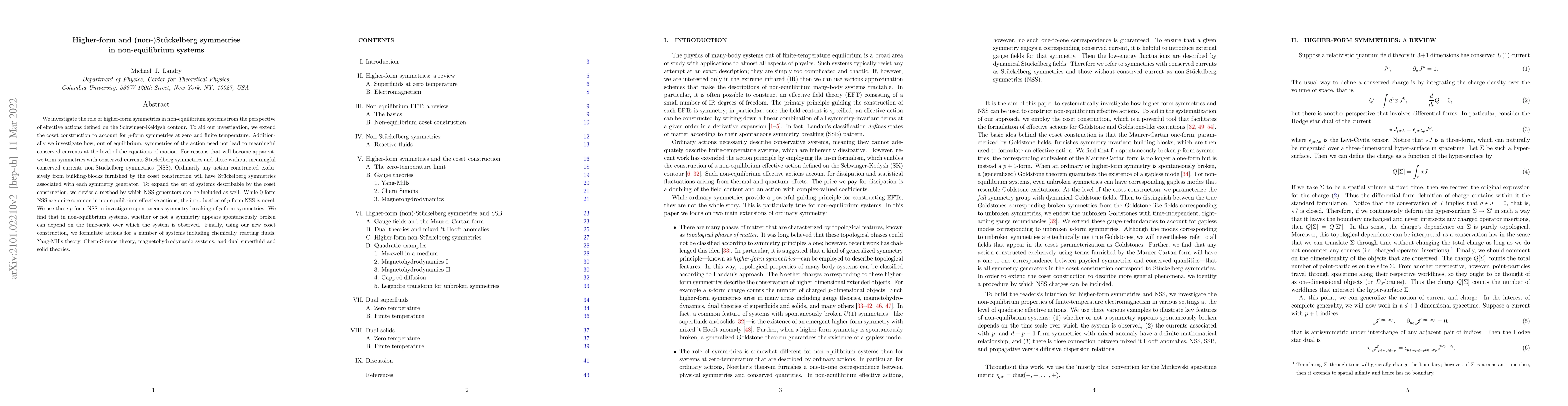 We investigate the role of higher-form symmetries in non-equilibrium systems from the perspective of effective actions defined on the Schwinger-Keldysh contour. To aid our investigation, we extend the coset construction to account for $p$-form symmetries at zero and finite temperature. Additionally we investigate how, out of equilibrium, symmetries of the action need not lead to meaningful conserved currents at the level of the equations of motion. For reasons that will become apparent, we term symmetries with conserved currents St\"uckelberg symmetries and those without meaningful conserved currents non-St\"uckelberg symmetries (NSS). Ordinarily any action constructed exclusively from building-blocks furnished by the coset construction will have St\"uckelberg symmetries associated with each symmetry generator. To expand the set of systems describable by the coset construction, we devise a method by which NSS generators can be included as well. While 0-form NSS are quite common in non-equilibrium effective actions, the introduction of $p$-form NSS is novel. We use these $p$-form NSS to investigate spontaneous symmetry breaking of $p$-form symmetries. We find that in non-equilibrium systems, whether or not a symmetry appears spontaneously broken can depend on the time-scale over which the system is observed. Finally, using our new coset construction, we formulate actions for a number of systems including chemically reacting fluids, Yang-Mills theory, Chern-Simons theory, magnetohydrodynamic systems, and dual superfluid and solid theories.