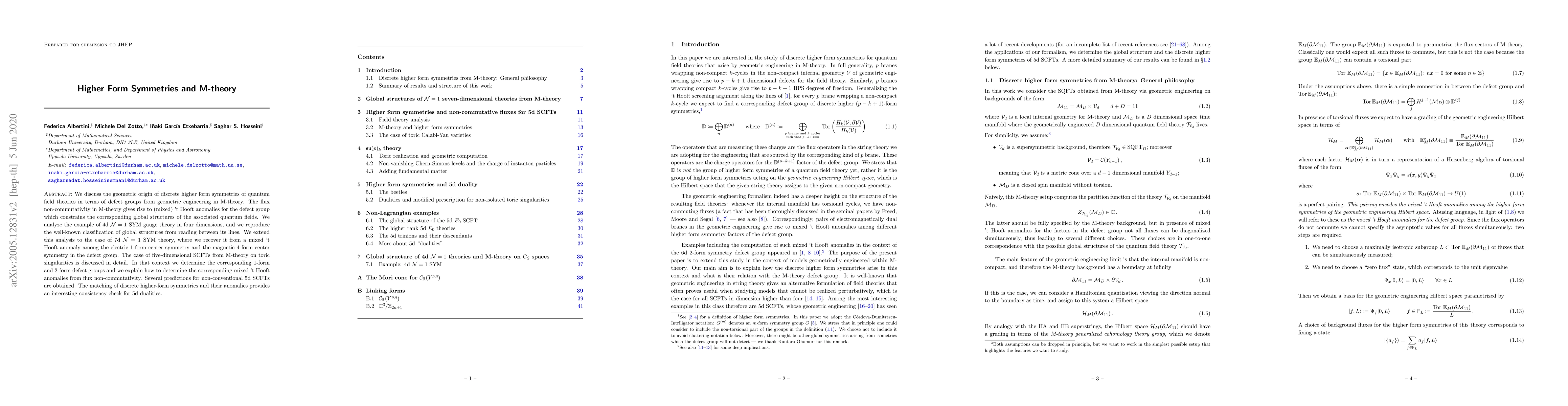 The paper presents a detailed analysis of higher form symmetries in quantum field theories using M-theory, identifying their geometric origins and constraints through defect groups and flux non-commutativity.