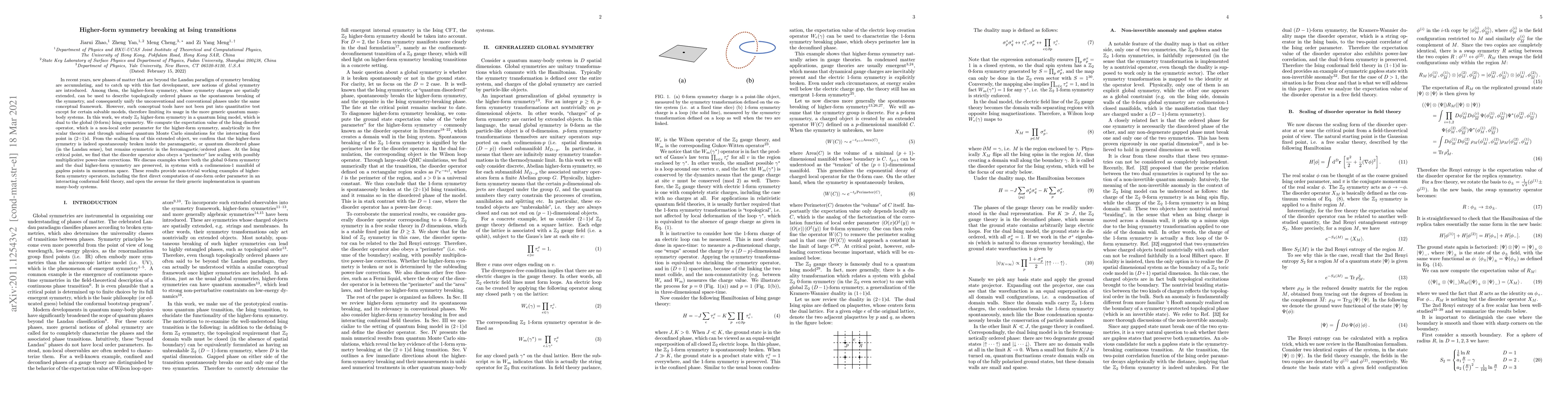 In recent years, new phases of matter that are beyond the Landau paradigm of symmetry breaking are mountaining, and to catch up with this fast development, new notions of global symmetry are introduced. Among them, the higher-form symmetry, whose symmetry charges are spatially extended, can be used to describe topologically ordered phases as the spontaneous breaking of the symmetry, and consequently unify the unconventional and conventional phases under the same conceptual framework. However, such conceptual tools have not been put into quantitative test except for certain solvable models, therefore limiting its usage in the more generic quantum manybody systems. In this work, we study Z2 higher-form symmetry in a quantum Ising model, which is dual to the global (0-form) Ising symmetry. We compute the expectation value of the Ising disorder operator, which is a non-local order parameter for the higher-form symmetry, analytically in free scalar theories and through unbiased quantum Monte Carlo simulations for the interacting fixed point in (2+1)d. From the scaling form of this extended object, we confirm that the higher-form symmetry is indeed spontaneously broken inside the paramagnetic, or quantum disordered phase (in the Landau sense), but remains symmetric in the ferromagnetic/ordered phase. At the Ising critical point, we find that the higher-form symmetry is also spontaneously broken, even though the 0-form symmetry is preserved. We discuss examples where both the global 0-form symmetry and the dual higher-form symmetry are preserved, in systems with a codimension-1 manifold of gapless points in momentum space. These results provide non-trivial working examples of higher-form symmetry operators, including the first computation of one-form order parameter in an interacting conformal field theory, and open the avenue for their generic implementation in quantum many-body systems.