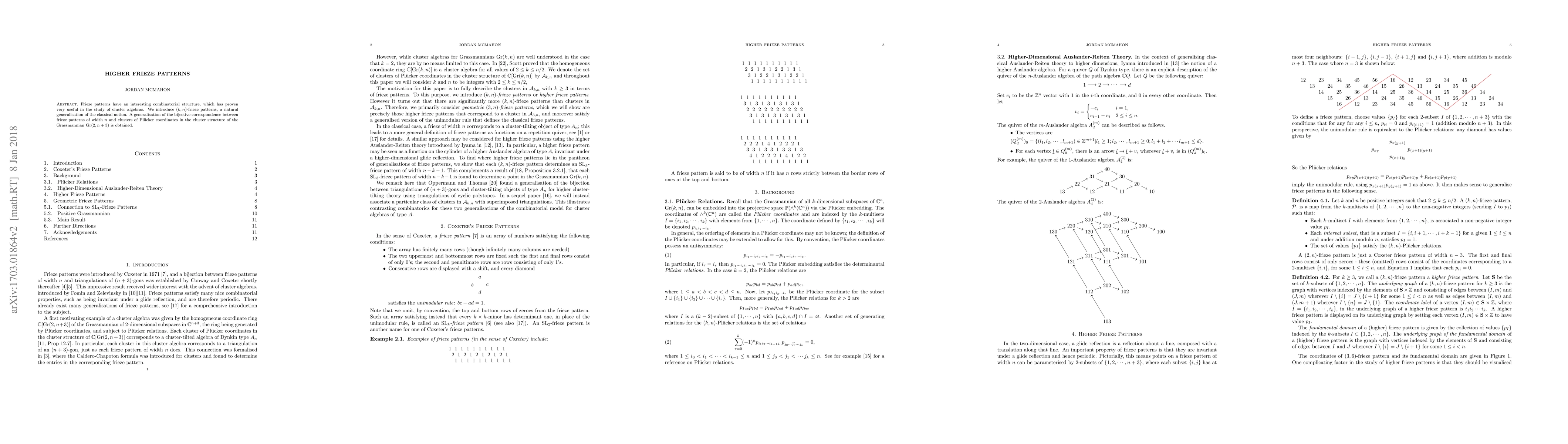 This paper introduces $(k,n)$-frieze patterns, a generalization of classical frieze patterns, and establishes a bijective correspondence between these patterns and clusters of Plücker coordinates in the Grassmannian $\mathrm{Gr}(2,n+3)$, extending their utility in cluster algebra studies.