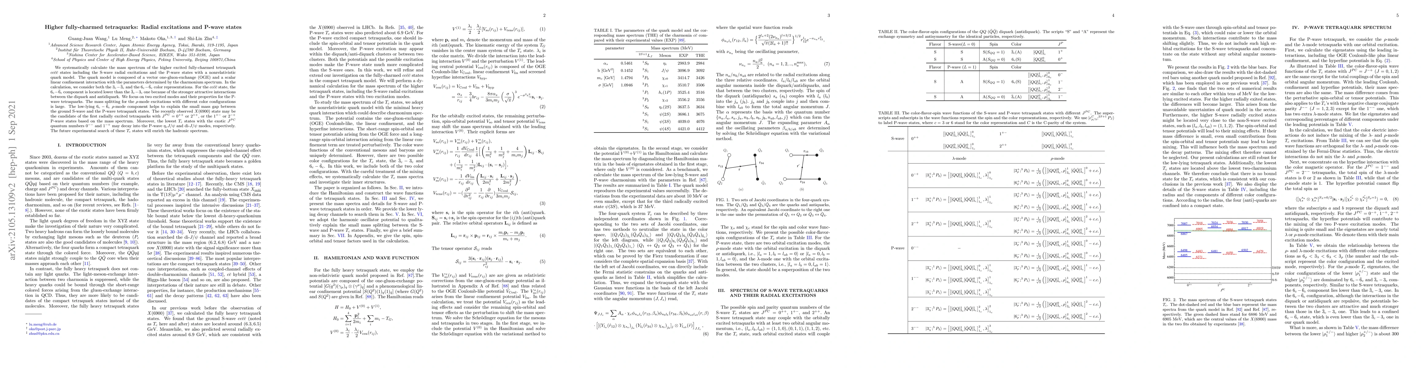 We systematically calculate the mass spectrum of the higher excited fully-charmed tetraquark $cc\bar c\bar c$ states including the S-wave radial excitations and the P-wave states with a nonrelativistic quark model. The quark model is composed of a vector one-gluon-exchange (OGE) and a scalar linear confinement interaction with the parameters determined by the charmonium spectrum. In the calculation, we consider both the $3_c-\bar 3_c$ and the $6_c-\bar{6}_c$ color representations. For the $cc\bar c\bar c $ state, the $6_c-\bar 6_c$ component is located lower than the $\bar 3_c-3_c$ one because of the stronger attractive interactions between the diquark and antidiquark. We focus on two excited modes and their properties for the P-wave tetraquarks. The mass splitting for the $\rho$-mode excitations with different color configurations is large. The low-lying $6_c-\bar 6_c$ $\rho$-mode component helps to explain the small mass gap between the ground S-wave and the P-wave tetraquark states. The recently observed $X(6900)$ state may be the candidate of the first radially excited tetraquarks with $J^{PC}=0^{++}$ or $2^{++}$, or the $1^{+-}$ or $2^{-+}$ P-wave states based on the mass spectrum. Moreover, the lowest $T_c$ states with the exotic $J^{PC}$ quantum numbers $0^{--}$ and $1^{-+}$ may decay into the P-wave $\eta_c J/\psi$ and di-$J/\psi$ modes, respectively. The future experimental search of these $T_c$ states will enrich the hadronic spectrum.
