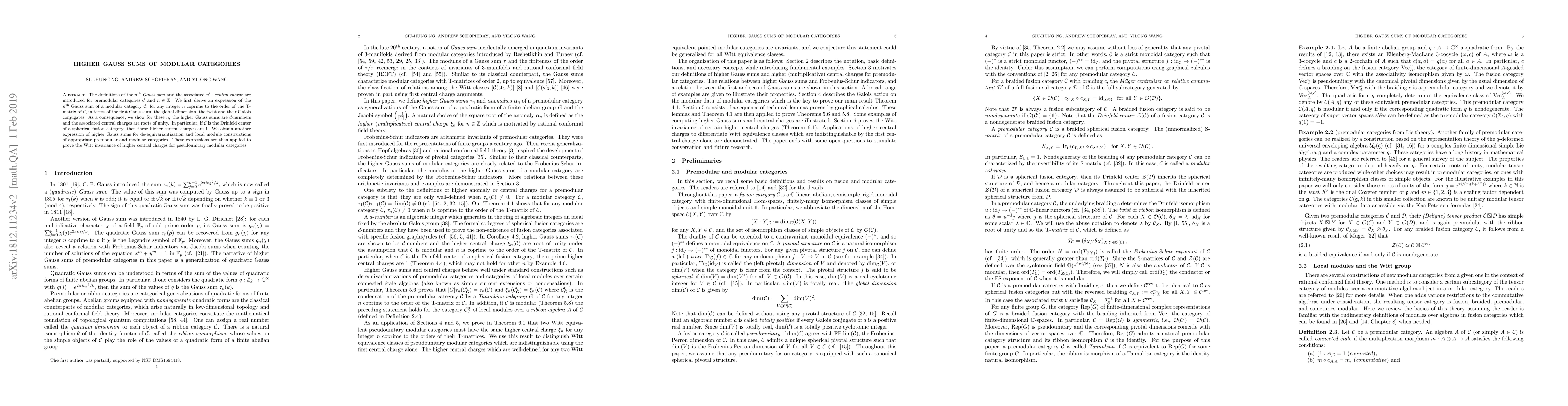 This paper introduces higher Gauss sums and their associated central charges for premodular categories, showing they are $d$-numbers and roots of unity under certain conditions, particularly for the Drinfeld center of spherical fusion categories. It also proves the Witt invariance of these central charges in pseudounitary modular categories.