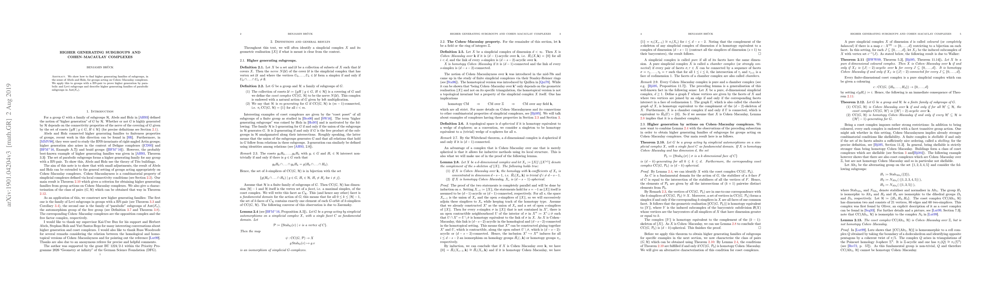 We show how to find higher generating families of subgroups, in the sense of Abels and Holz, for groups acting on Cohen-Macaulay complexes. We apply this to groups with a BN-pair to prove higher generation by parabolic and Levi-subgroups and describe higher generating families of parabolic subgroups in Aut(F_n).