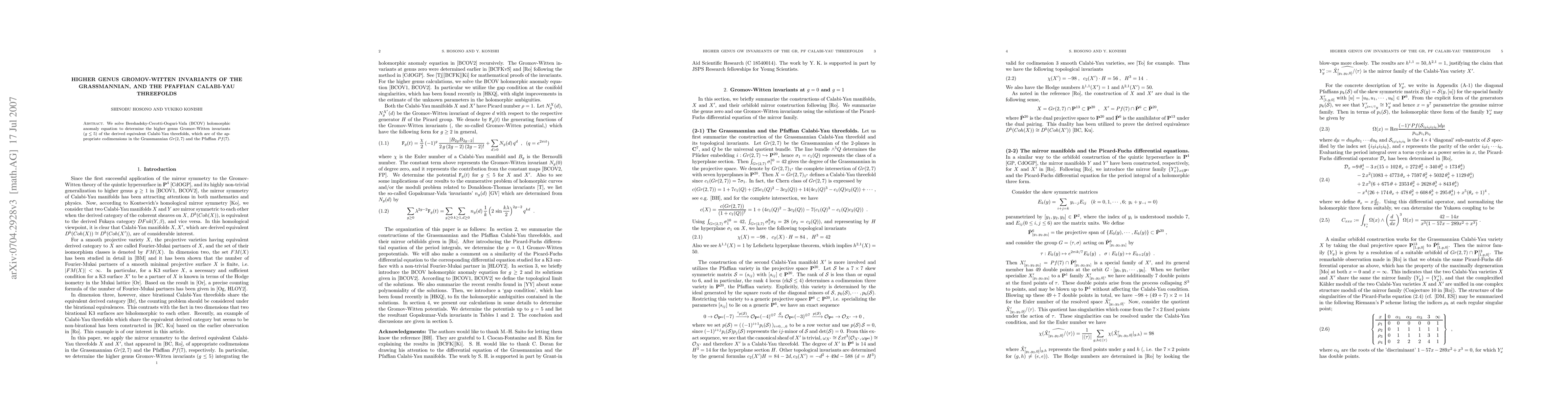 We solve Bershadsky-Cecotti-Ooguri-Vafa (BCOV) holomorphic anomaly equation to determine the higher genus Gromov-Witten invariants ($g \leq 5$) of the derived equivalent Calabi-Yau threefolds, which are of the appropriate codimensions in the Grassmannian Gr(2,7) and the Pfaffian Pf(7).
