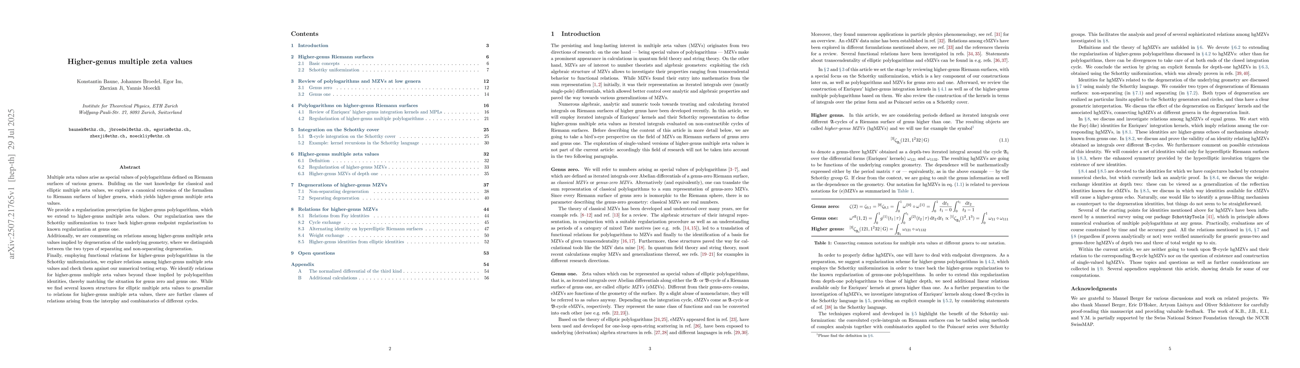 The paper introduces a regularization prescription for higher-genus polylogarithms and develops a comprehensive analysis of higher-genus multiple zeta values, extending existing knowledge to higher genera.