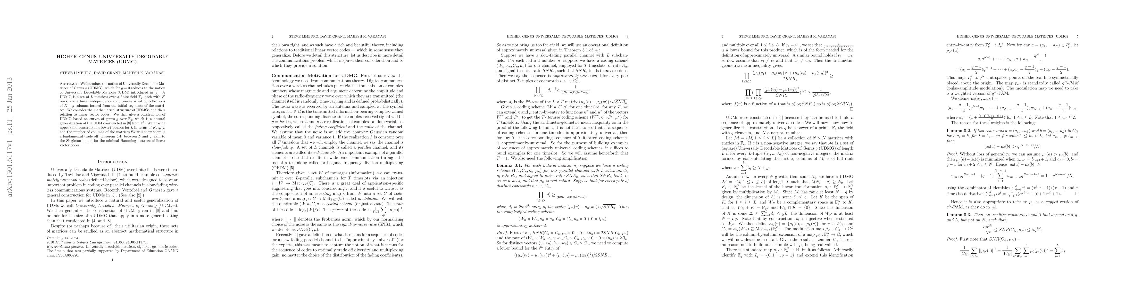 This paper introduces Universally Decodable Matrices of Genus g (UDMG), a generalization of Universally Decodable Matrices (UDM), and explores their mathematical structure and relation to linear vector codes. It provides a construction based on genus g curves and establishes bounds for the number of matrices, highlighting a fundamental tradeoff between the number of matrices and genus akin to the Singleton bound.