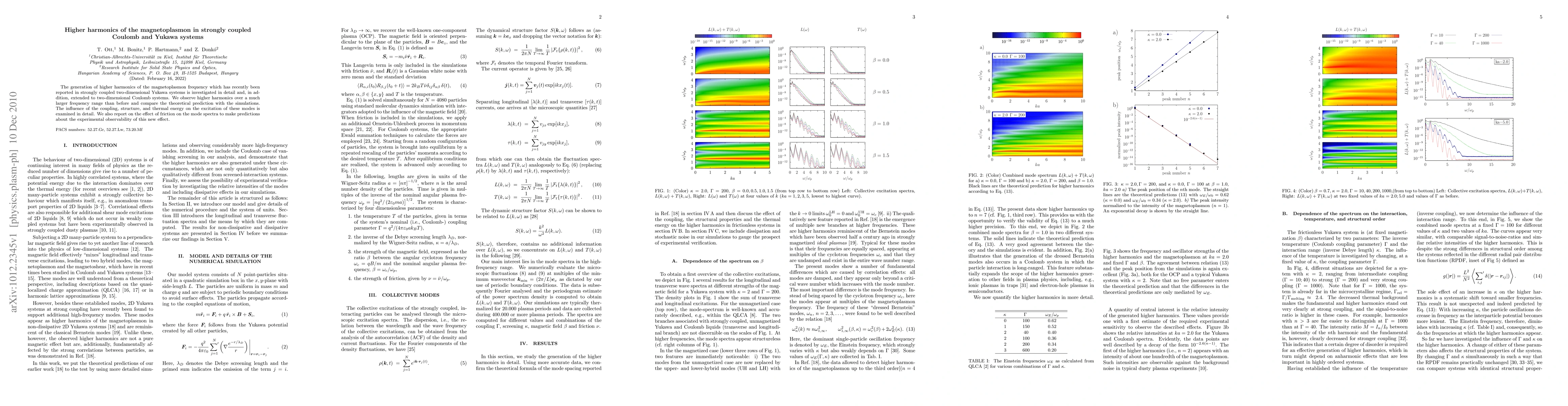 The generation of higher harmonics of the magnetoplasmon frequency which has recently been reported in strongly coupled two-dimensional Yukawa systems is investigated in detail and, in addition, extended to two-dimensional Coulomb systems. We observe higher harmonics over a much larger frequency range than before and compare the theoretical prediction with the simulations. The influence of the coupling, structure, and thermal energy on the excitation of these modes is examined in detail. We also report on the effect of friction on the mode spectra to make predictions about the experimental observability of this new effect.