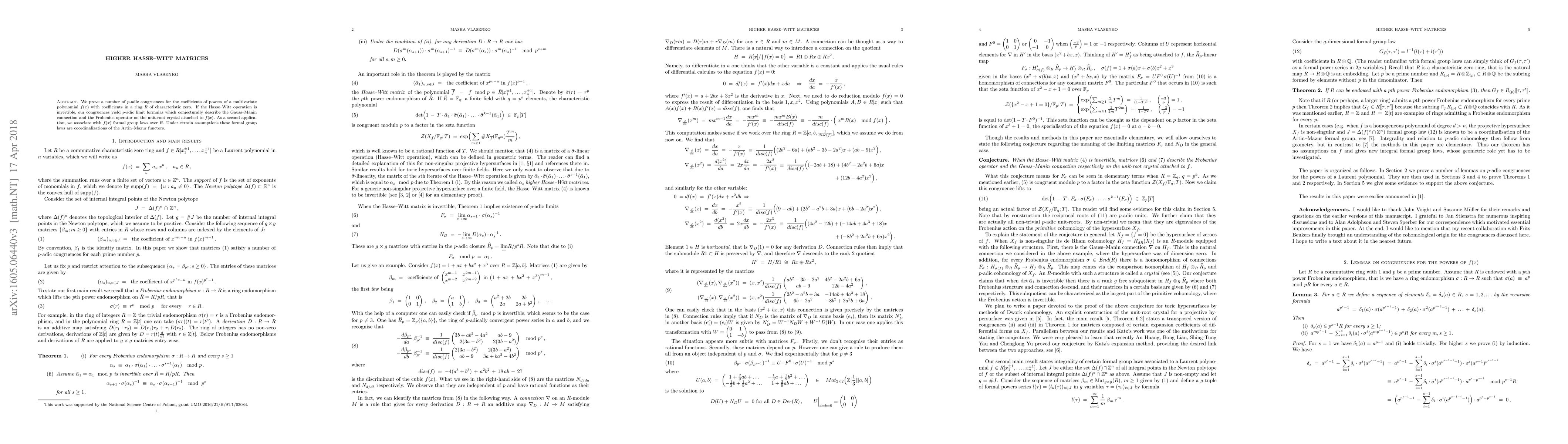 We prove a number of p-adic congruences for the coefficients of powers of a multivariate polynomial f(x) with coefficients in a ring R of characteristic zero. If the Hasse--Witt operation is invertible, our congruences yield p-adic limit formulas which conjecturally describe the Gauss--Manin connection and the Frobenius operator on the unit-root crystal attached to f(x). As a second application, we associate with f(x) formal group laws over R. Under certain assumptions these formal group laws are coordinalizations of the Artin--Mazur functors. (This is a final version which we send for a publication.)