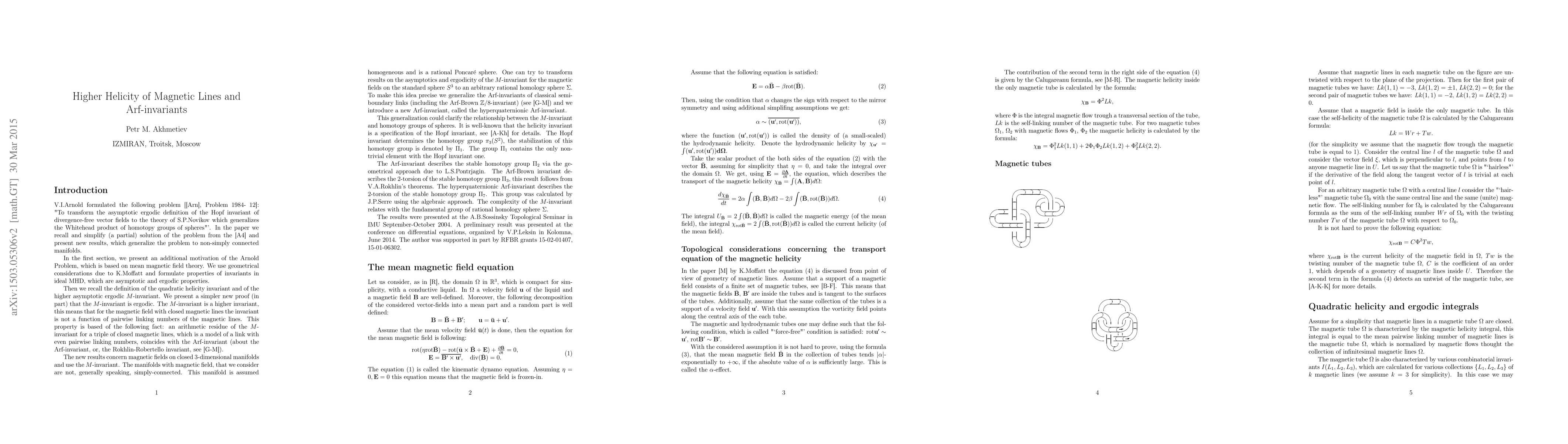 We recall the definition of the quadratic helicity invariant and of the higher asymptotic ergodic $M$-invariant. We present a simpler new proof (in part) that the $M$-invariant is ergodic. The $M$-invariant is a higher invariant, this means that for the magnetic field with closed magnetic lines the invariant is not a function of pairwise linking numbers of the magnetic lines. This property is based of the following fact: an arithmetic residue of the $M$-invariant for a triple of closed magnetic lines (such a triple is a model of a link with even pairwise linking coefficients) coincides with the Arf-invariant. The new results concern magnetic fields on closed 3-dimensional manifolds and use the $M$-invariant. To make this idea precise we generalize the Arf-invariants of classical semi-boundary links (including the Arf-Brown invariant) and we introduce a new Arf-invariant, called the hyperquaternionic Arf-invariant.