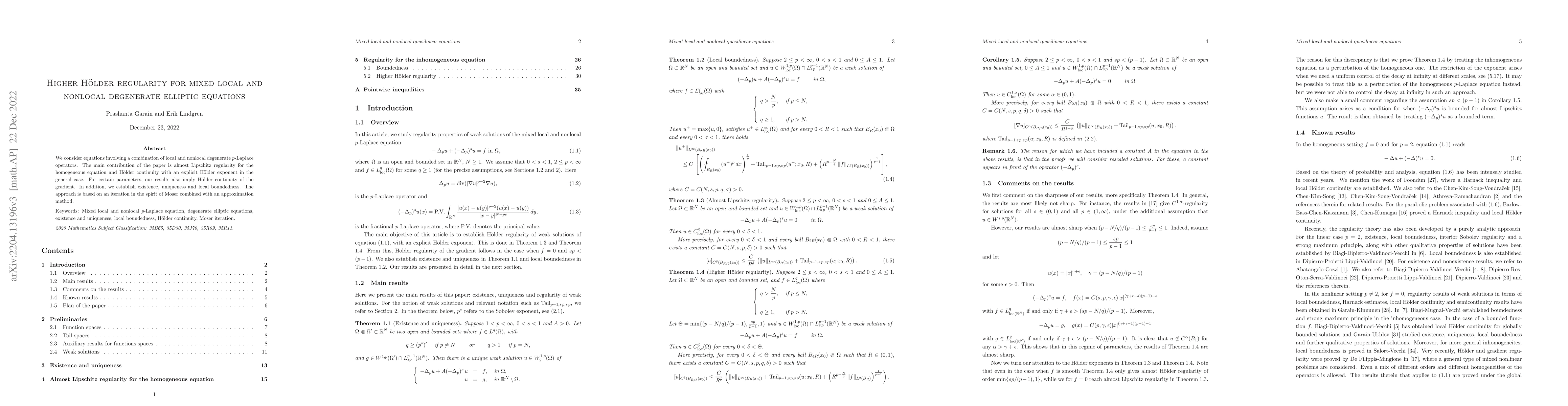 We consider equations involving a combination of local and nonlocal degenerate $p$-Laplace operators. The main contribution of the paper is almost Lipschitz regularity for the homogeneous equation and H\"older continuity with an explicit H\"older exponent in the general case. For certain parameters, our results also imply H\"older continuity of the gradient. In addition, we establish existence, uniqueness and local boundedness. The approach is based on an iteration in the spirit of Moser combined with an approximation method.
