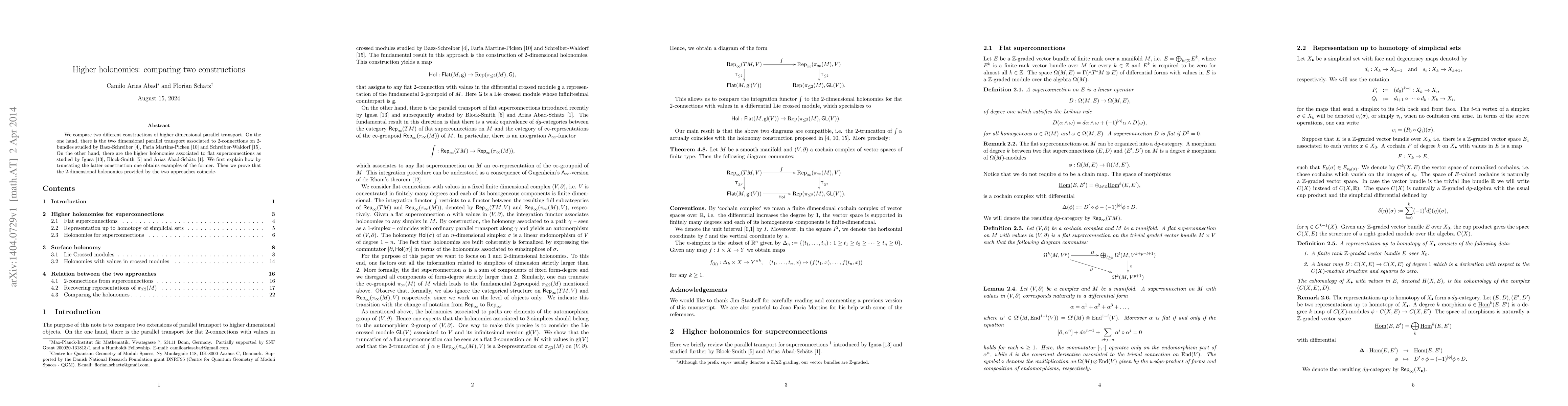 This paper compares two constructions of higher dimensional parallel transport: 2-dimensional holonomies from 2-connections on 2-bundles and higher holonomies from flat superconnections. It demonstrates that truncating the latter yields examples of the former and proves that the resulting 2-dimensional holonomies are equivalent.