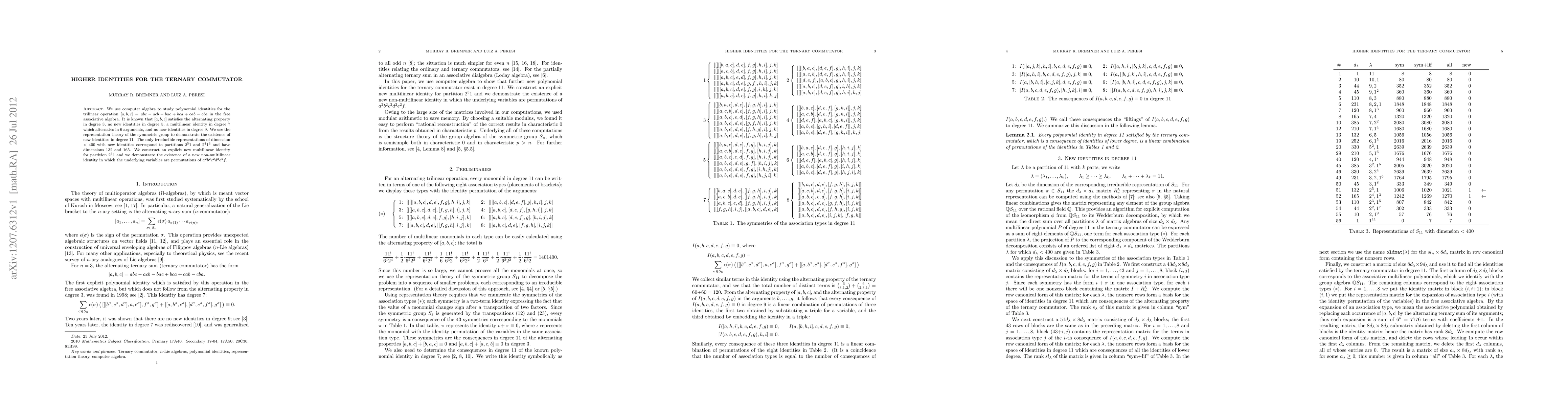 Researchers discovered new identities for the ternary commutator operation in degree 11, using representation theory of the symmetric group to analyze multilinear and non-multilinear polynomial identities.
