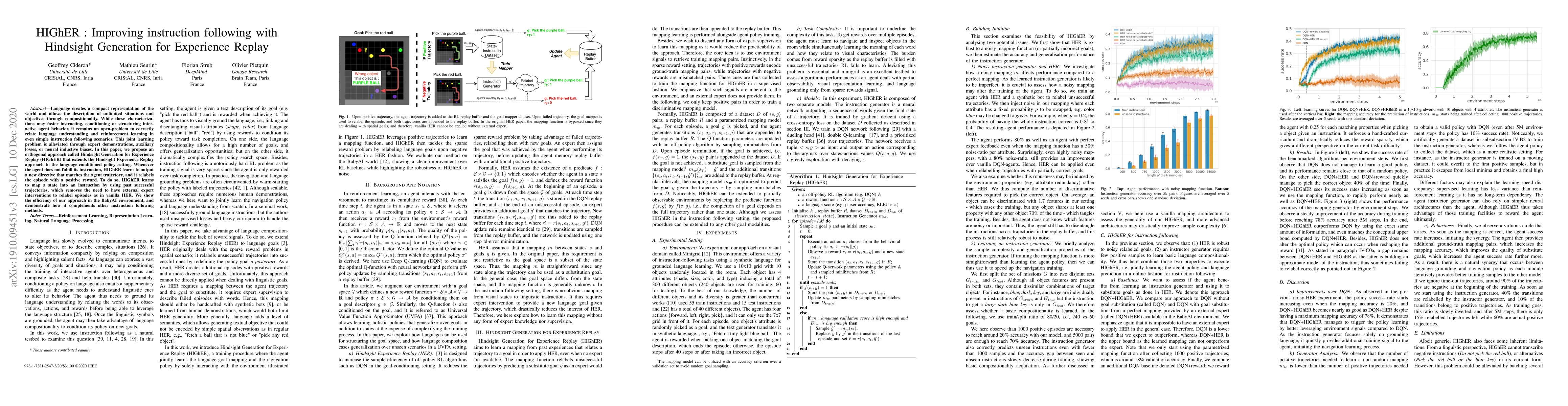 This paper proposes HIGhER, a method that enhances instruction following by extending Hindsight Experience Replay to language-conditioned policies. HIGhER generates new directives to relabel episodes when the agent fails, thus improving learning without external expert interventions.