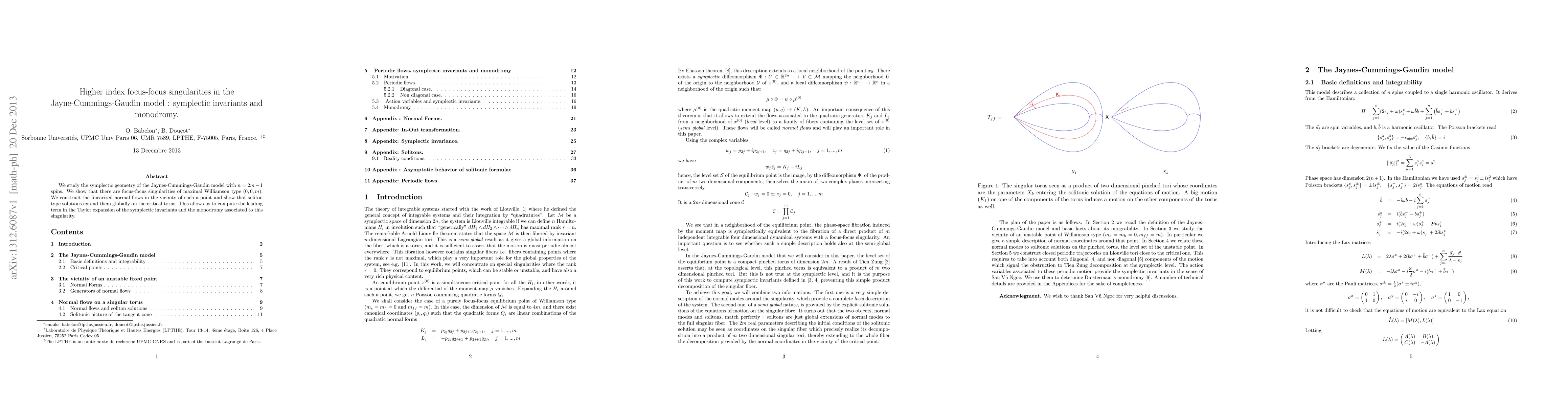 This paper investigates the symplectic geometry of the Jaynes-Cummings-Gaudin model with odd spin numbers, identifying maximal focus-focus singularities of type $(0,0,m)$. It demonstrates soliton-type solutions extending from linearized normal flows near these singularities, enabling computation of the leading term in the Taylor expansion for symplectic invariants and monodromy.
