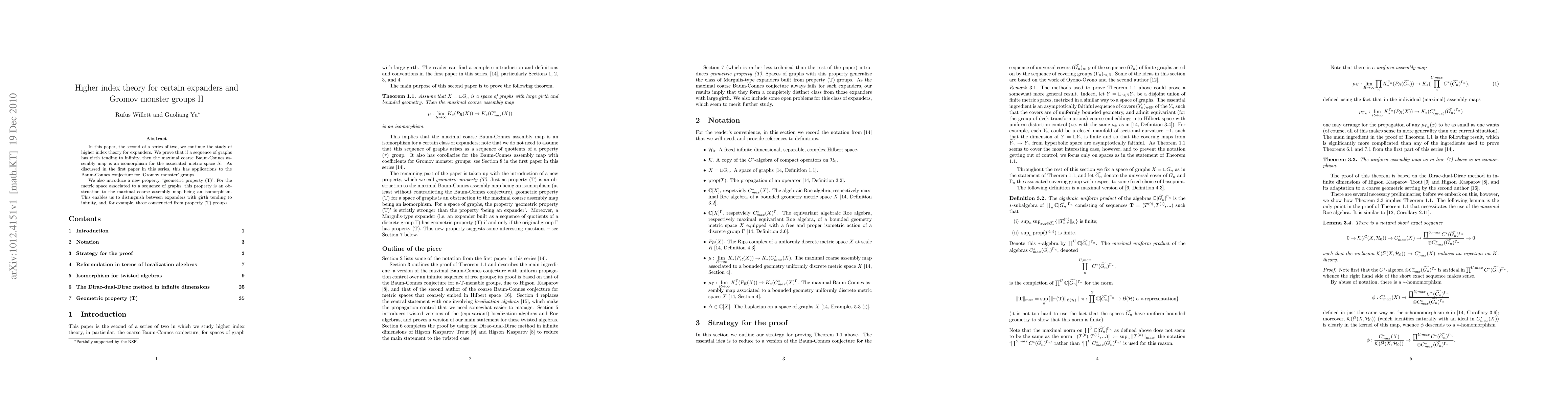 This paper continues the study of higher index theory for expanders, proving that sequences of graphs with increasing girth lead to the maximal coarse Baum-Connes assembly map being an isomorphism for the associated metric space. It introduces the new "geometric property (T)" to distinguish expanders from those constructed from property (T) groups.