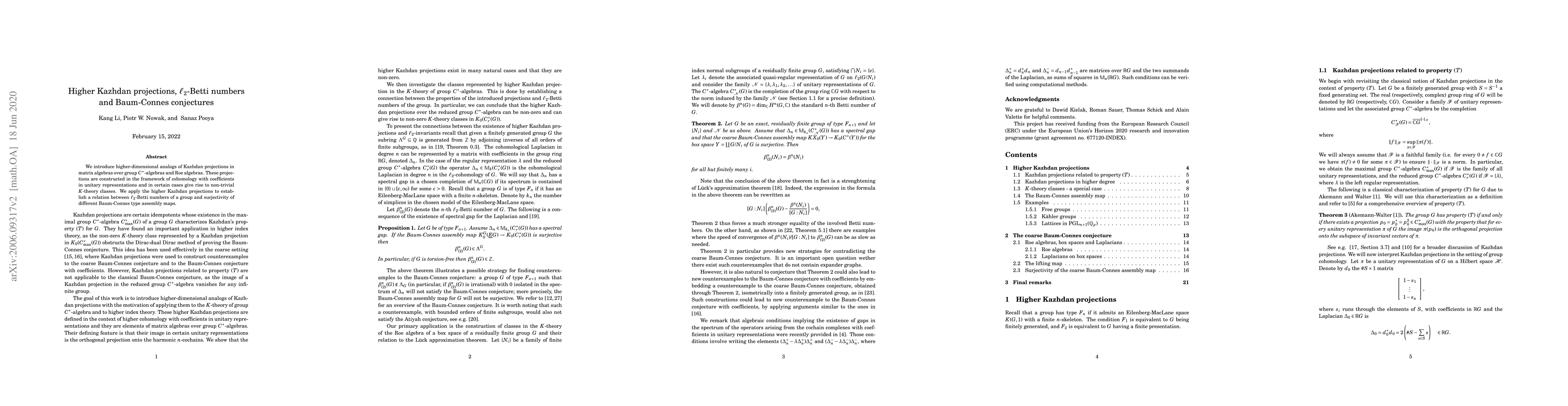 Summary: This paper develops higher-dimensional Kazhdan projections in matrix algebras and relates them to $\ell_2$-Betti numbers and the surjectivity of Baum-Connes assembly maps, using cohomology with unitary representation coefficients.