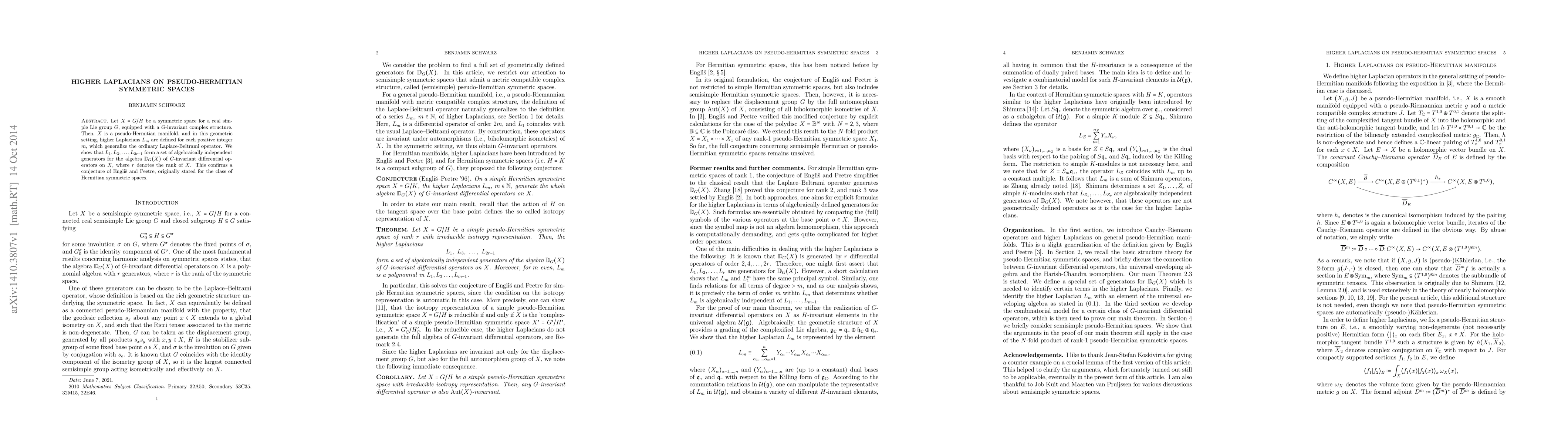 This paper investigates higher Laplacians on pseudo-Hermitian symmetric spaces, showing that odd-indexed higher Laplacians $L_1, L_3, \ldots, L_{2r-1}$ generate the algebra of $G$-invariant differential operators. This confirms a conjecture by Engliš and Peetre originally proposed for Hermitian symmetric spaces.