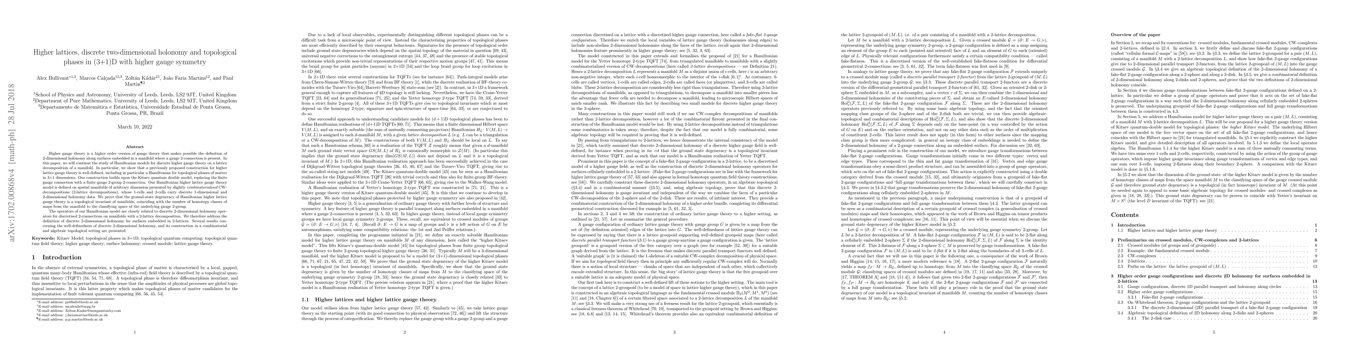 Higher gauge theory is a higher order version of gauge theory that makes possible the definition of 2-dimensional holonomy along surfaces embedded in a manifold where a gauge 2-connection is present. In this paper, we will continue the study of Hamiltonian models for discrete higher gauge theory on a lattice decomposition of a manifold. In particular, we show that a previously proposed construction for higher lattice gauge theory is well-defined, including in particular a Hamiltonian for topological phases of matter in 3+1 dimensions. Our construction builds upon the Kitaev quantum double model, replacing the finite gauge connection with a finite gauge 2-group 2-connection. Our Hamiltonian higher lattice gauge theory model is defined on spatial manifolds of arbitrary dimension presented by slightly {\it combinatorialised} CW-decompositions (2-lattice decompositions), whose 1-cells and 2-cells carry discrete 1-dimensional and 2-dimensional holonomy data. We prove that the ground-state degeneracy of Hamiltonian higher lattice gauge theory is a topological invariant of manifolds, coinciding with the number of homotopy classes of maps from the manifold to the classifying space of the underlying gauge 2-group. The operators of our Hamiltonian model are closely related to discrete 2-dimensional holonomy operators for discretised 2-connections on manifolds with a 2-lattice decomposition. We therefore address the definition of discrete 2-dimensional holonomy for surfaces embedded in 2-lattices. Several results concerning the well-definedness of discrete 2-dimensional holonomy, and its construction in a combinatorial and algebraic topological setting are presented.