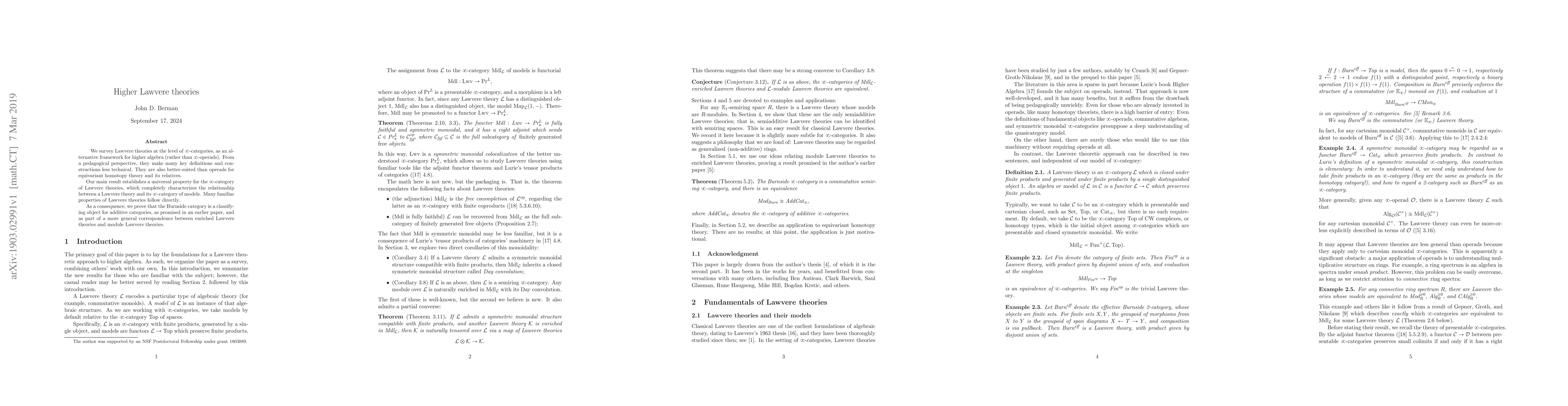 This paper explores Lawvere theories within the framework of infinity categories, presenting them as a more accessible alternative to infinity operads for higher algebra. The authors establish a universal property characterizing the relationship between Lawvere theories and their infinity category of models, leading to proofs of earlier results regarding the Burnside category as a classifying object for additive categories.