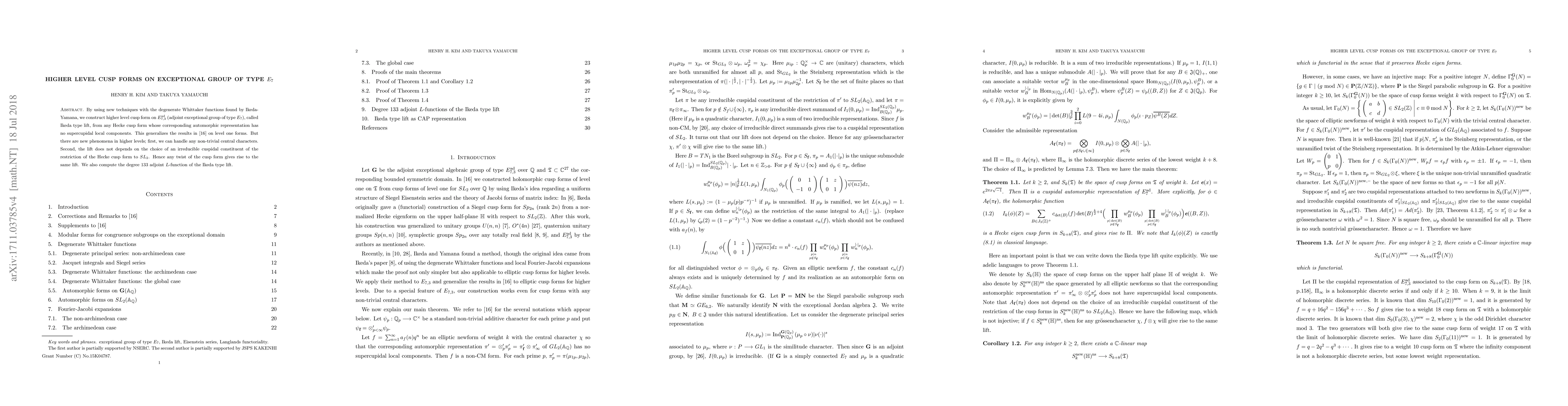 Summary: The paper constructs higher level cusp forms on the exceptional group $E_{7,3}$ using Ikeda-Yamana's degenerate Whittaker functions, generalizing level one forms. It introduces new phenomena such as handling non-trivial central characters and dependence on $SL_2$ restrictions, while noting ambiguity in lifts for square-free levels with trivial central characters.