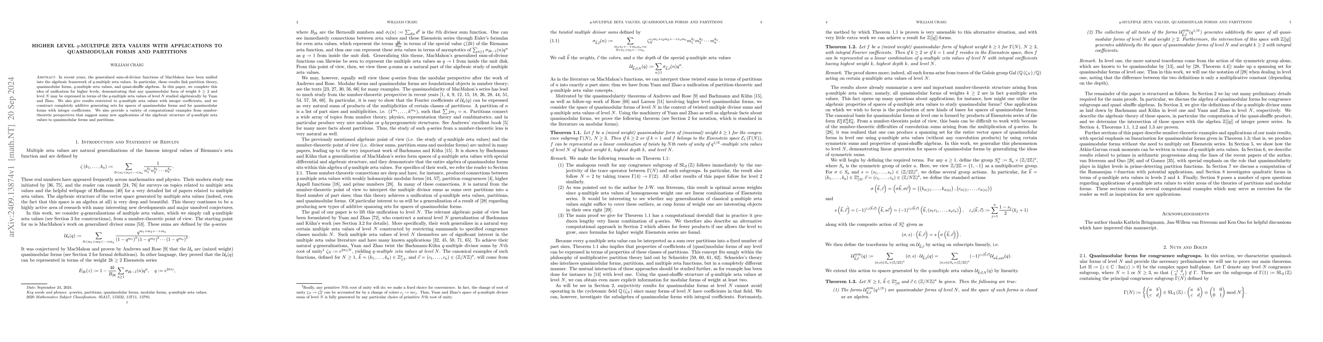 In recent years, the generalized sum-of-divisor functions of MacMahon have been unified into the algebraic framework of $q$-multiple zeta values. In particular, these results link partition theory, quasimodular forms, $q$-multiple zeta values, and quasi-shuffle algebras. In this paper, we complete this idea of unification for higher levels, demonstrating that any quasimodular form of weight $k \geq 2$ and level $N$ may be expressed in terms of the $q$-multiple zeta values of level $N$ studied algebraically by Yuan and Zhao. We also give results restricted to $q$-multiple zeta values with integer coefficients, and we construct completely additive generating sets for spaces of quasimodular forms and for quasimodular forms with integer coefficients. We also provide a variety of computational examples from number-theoretic perspectives that suggest many new applications of the algebraic structure of $q$-multiple zeta values to quasimodular forms and partitions.