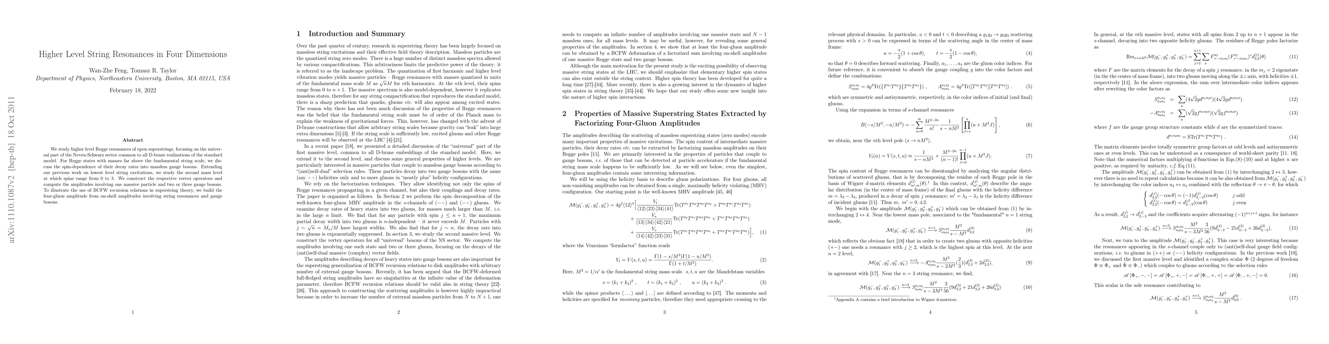 We study higher level Regge resonances of open superstrings, focusing on the universal part of the Neveu-Schwarz sector common to all D-brane realizations of the standard model. For Regge states with masses far above the fundamental string scale, we discuss the spin-dependence of their decay rates into massless gauge bosons. Extending our previous work on lowest level string excitations, we study the second mass level at which spins range from 0 to 3. We construct the respective vertex operators and compute the amplitudes involving one massive particle and two or three gauge bosons. To illustrate the use of BCFW recursion relations in superstring theory, we build the four gluon amplitude from on-shell amplitudes involving string resonances and gauge bosons.