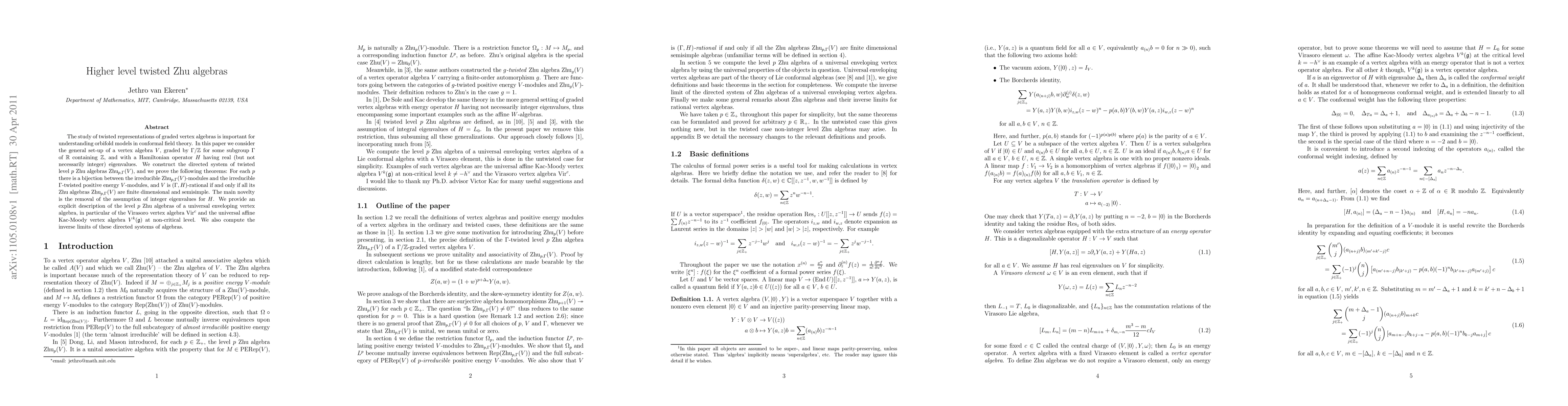 The study of twisted representations of graded vertex algebras is important for understanding orbifold models in conformal field theory. In this paper we consider the general set-up of a vertex algebra $V$, graded by $\G/\Z$ for some subgroup $\G$ of $\R$ containing $\Z$, and with a Hamiltonian operator $H$ having real (but not necessarily integer) eigenvalues. We construct the directed system of twisted level $p$ Zhu algebras $\zhu_{p, \G}(V)$, and we prove the following theorems: For each $p$ there is a bijection between the irreducible $\zhu_{p, \G}(V)$-modules and the irreducible $\G$-twisted positive energy $V$-modules, and $V$ is $(\G, H)$-rational if and only if all its Zhu algebras $\zhu_{p, \G}(V)$ are finite dimensional and semisimple. The main novelty is the removal of the assumption of integer eigenvalues for $H$. We provide an explicit description of the level $p$ Zhu algebras of a universal enveloping vertex algebra, in particular of the Virasoro vertex algebra $\vir^c$ and the universal affine Kac-Moody vertex algebra $V^k(\g)$ at non-critical level. We also compute the inverse limits of these directed systems of algebras.