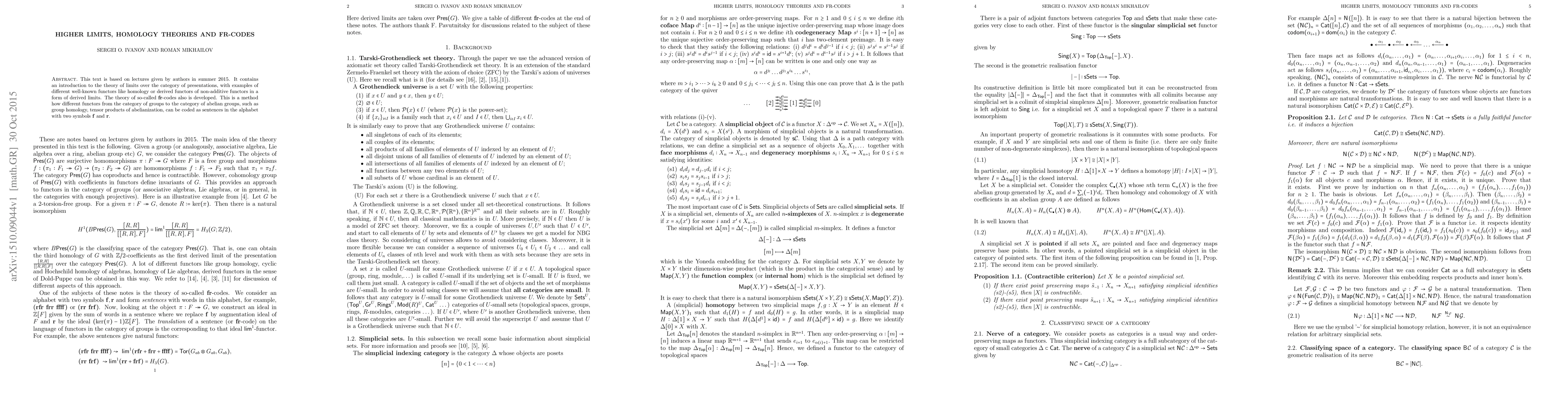 This text is based on lectures given by authors in summer 2015. It contains an introduction to the theory of limits over the category of presentations, with examples of different well-known functors like homology or derived functors of non-additive functors in a form of derived limits. The theory of so-called ${\bf fr}$-codes also is developed. This is a method how different functors from the category of groups to the category of abelian groups, such as group homology, tensor products of abelianization, can be coded as sentences in the alphabet with two symbols ${\bf f}$ and ${\bf r}$.