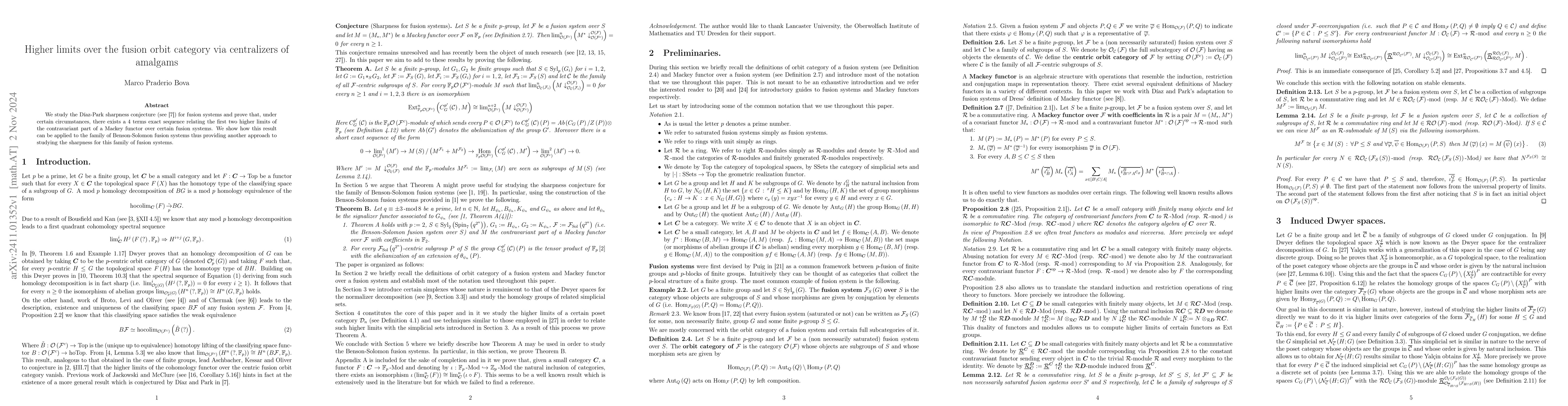 The research proves the D\'iaz-Park sharpness conjecture under specific conditions by establishing a 4-term exact sequence for higher limits in fusion systems, and applies this result to Benson-Solomon fusion systems to study their sharpness.