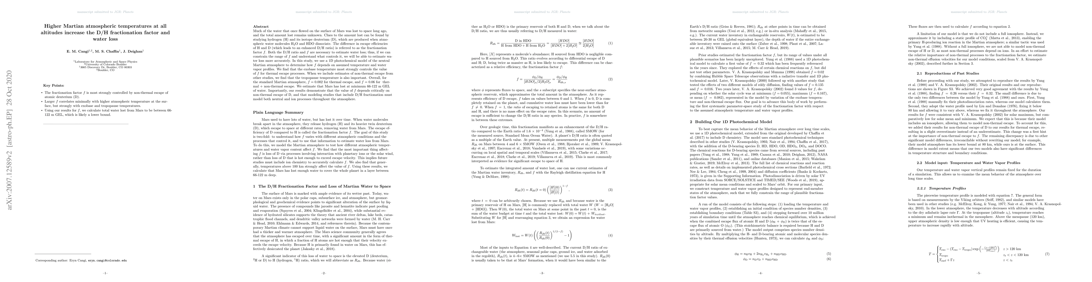 This study uses a 1D photochemical model to determine how higher Martian atmospheric temperatures influence the D/H fractionation factor, finding that both thermal and non-thermal escape processes significantly affect water loss. The research estimates Mars has lost a minimum of 66-122 m GEL of water, emphasizing the importance of modeling both neutral and ion processes.