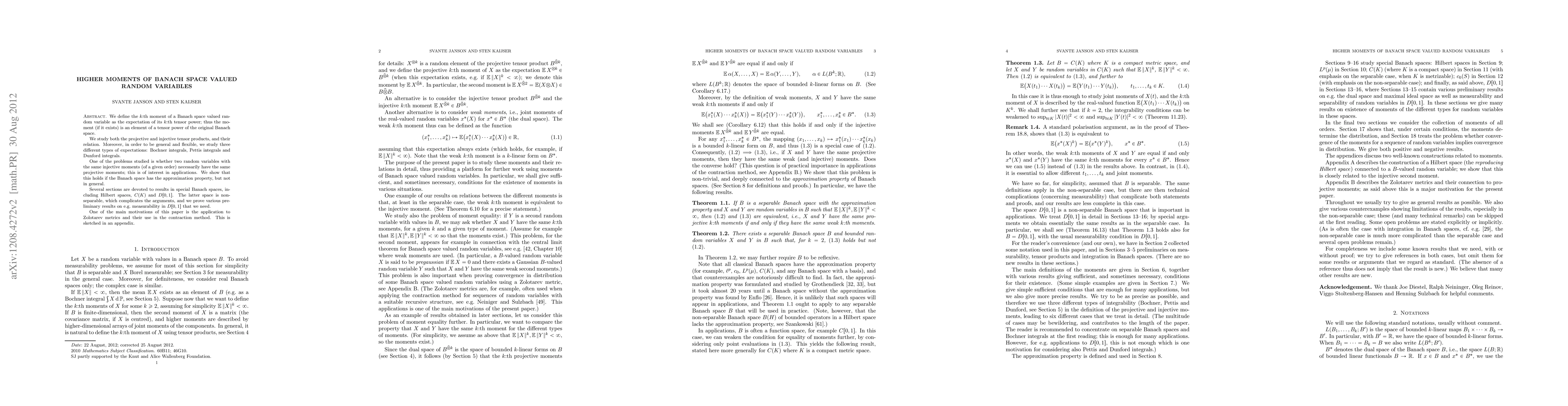 This paper defines higher moments of Banach space valued random variables using tensor powers and examines projective and injective tensor products. It explores various types of expectations and their implications, particularly focusing on whether identical injective moments imply identical projective moments, which is shown to hold under specific conditions. Special cases in Hilbert spaces and other Banach spaces are also discussed, with an application to Zolotarev metrics in the appendix.
