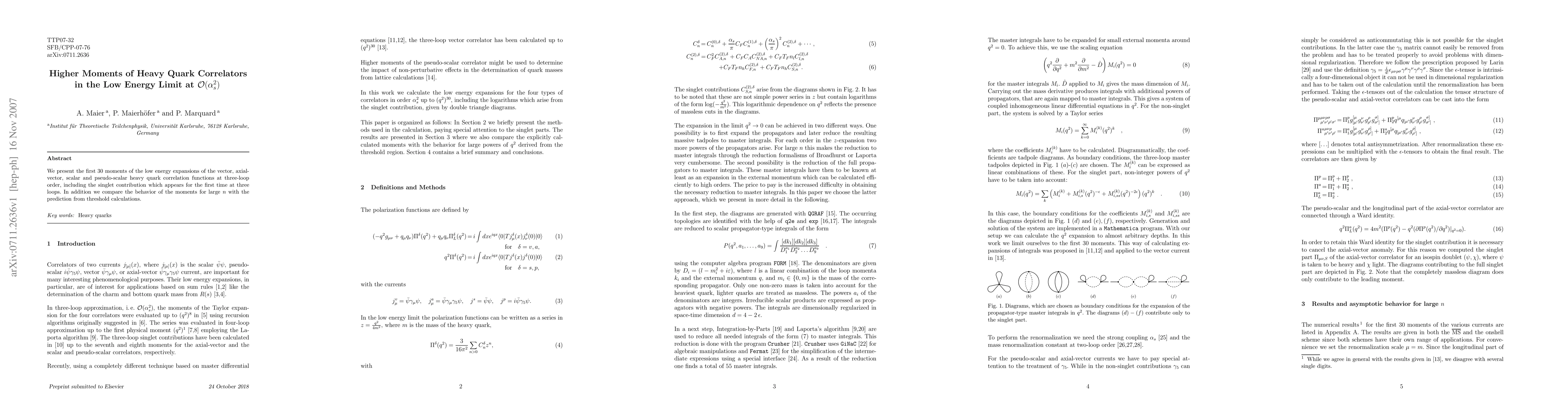 This paper calculates the first 30 moments of low energy expansions for heavy quark correlators at three-loop order, including the singlet contribution for the first time. It also compares these moments' behavior with predictions from threshold calculations.