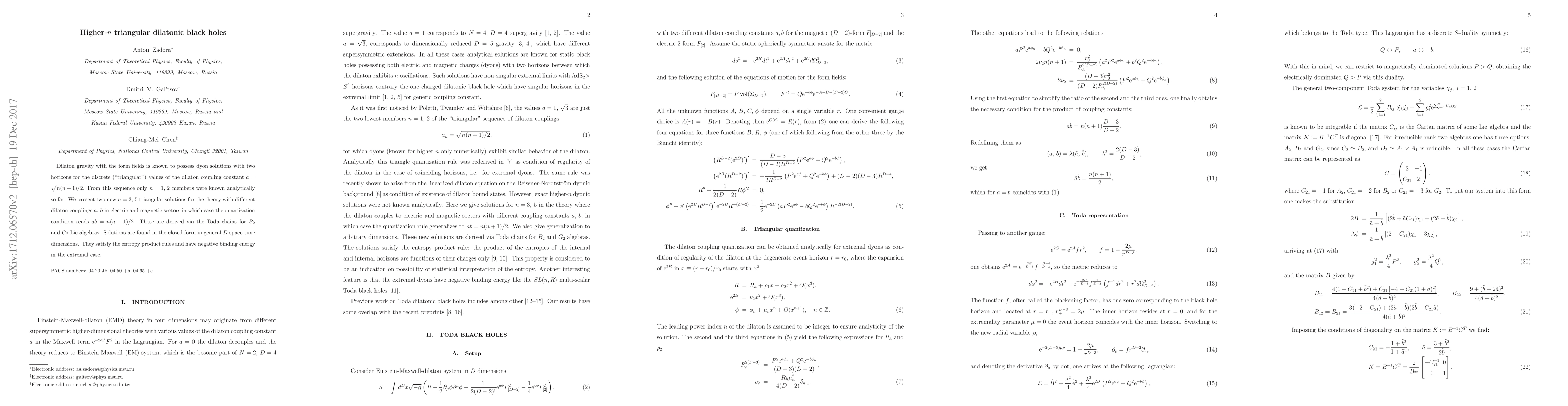 Dilaton gravity with the form fields is known to possess dyon solutions with two horizons for the discrete ("triangular") values of the dilaton coupling constant $a = \sqrt{n (n + 1)/2}$. From this sequence only $n = 1,\, 2$ members were known analytically so far. We present two new $n = 3,\, 5$ triangular solutions for the theory with different dilaton couplings $a,\, b$ in electric and magnetic sectors in which case the quantization condition reads $a b = n (n + 1)/2$. These are derived via the Toda chains for $B_2$ and $G_2$ Lie algebras. Solutions are found in the closed form in general $D$ space-time dimensions. They satisfy the entropy product rules and have negative binding energy in the extremal case.