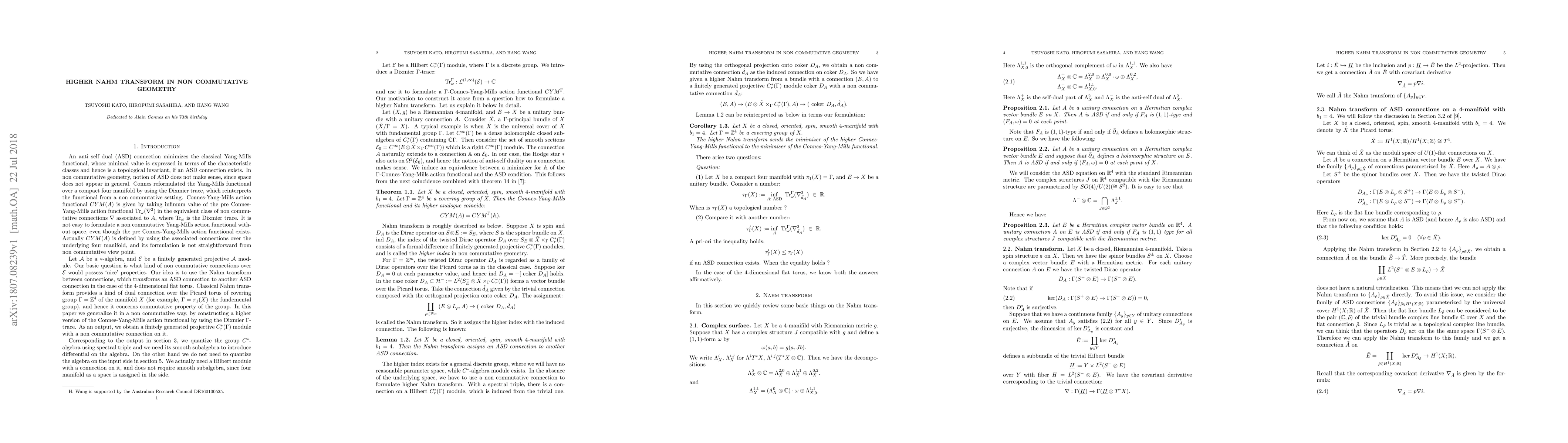 Summary: This paper introduces a noncommutative geometric version of the Nahm transform, extending the classical correspondence for anti-self-dual connections on four-manifolds to a setting that utilizes the Connes-Yang-Mills action functional formulated with Dixmier trace. The proposed transform aims to generalize the established connections in noncommutative geometry.