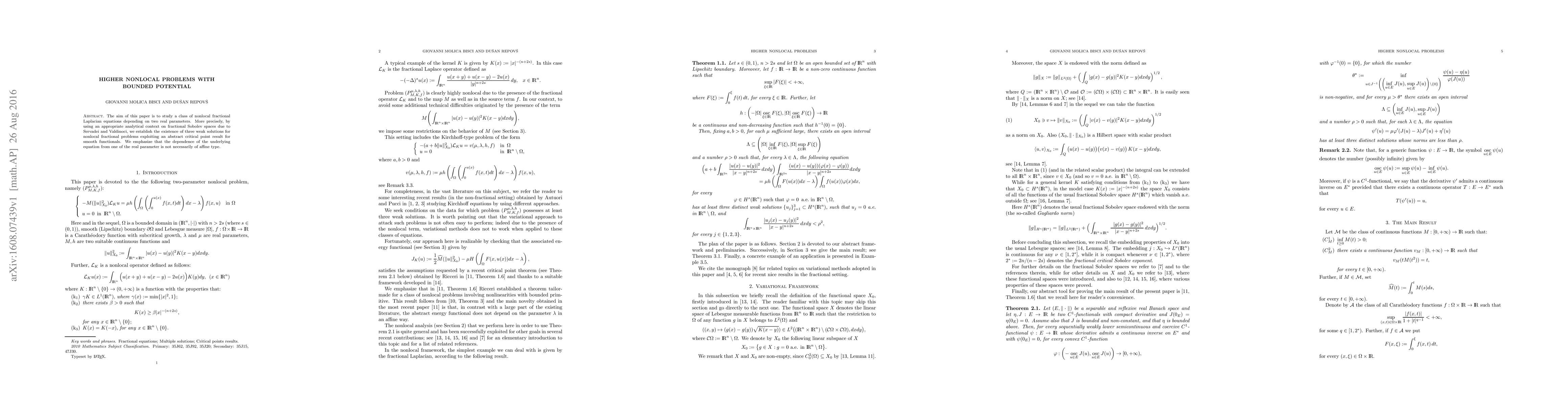 The aim of this paper is to study a class of nonlocal fractional Laplacian equations depending on two real parameters. More precisely, by using an appropriate analytical context on fractional Sobolev spaces due to Servadei and Valdinoci, we establish the existence of three weak solutions for nonlocal fractional problems exploiting an abstract critical point result for smooth functionals. We emphasize that the dependence of the underlying equation from one of the real parameter is not necessarily of affine type.