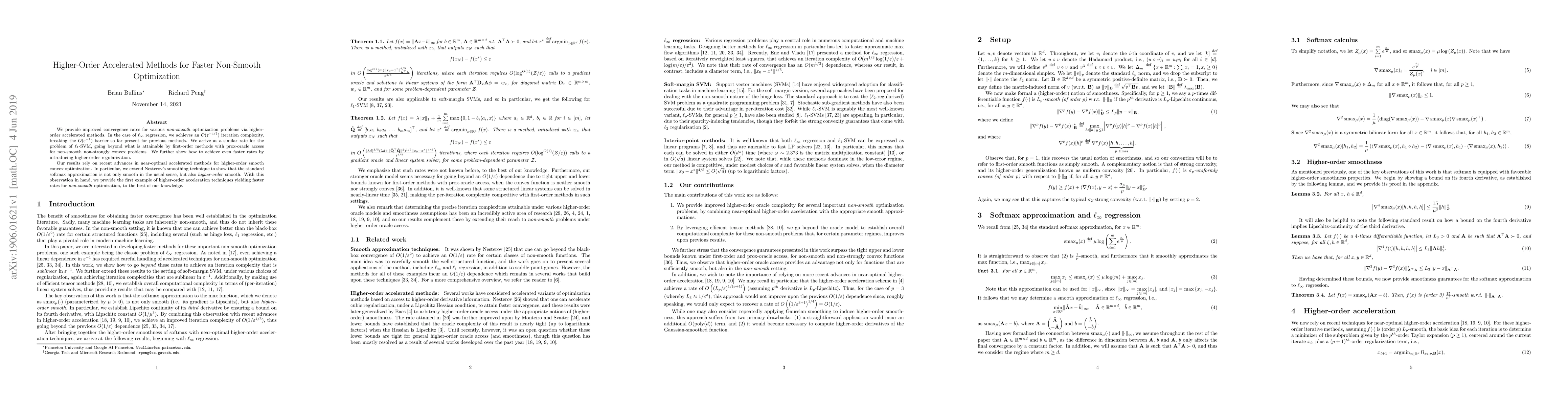 This paper introduces higher-order accelerated methods to achieve faster convergence rates for non-smooth optimization problems, notably achieving $O(\epsilon^{-4/5})$ iteration complexity for $\ell_\infty$ regression and similar rates for $\ell_1$-SVM, surpassing previous first-order methods. The authors extend Nesterov's smoothing technique to demonstrate higher-order smoothness, enabling the first known higher-order accelerated methods for non-smooth optimization.