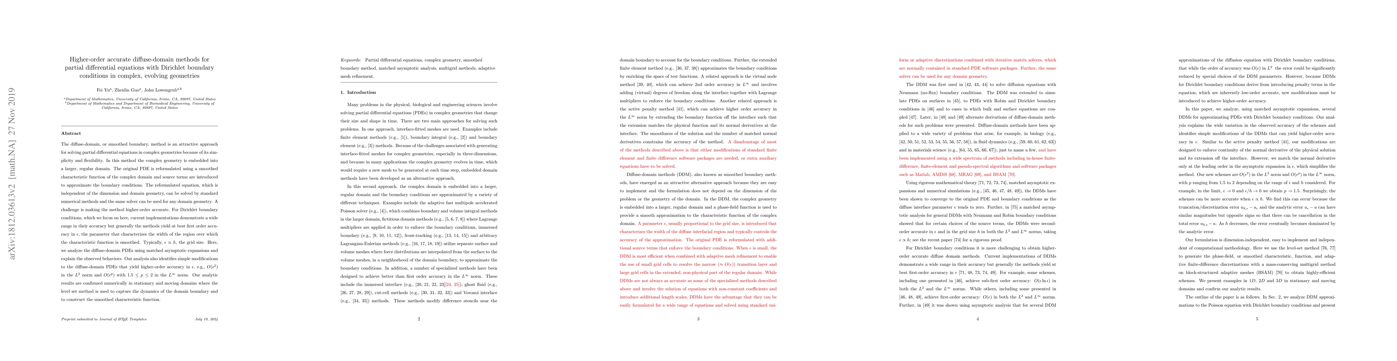 This paper proposes higher-order accurate diffuse-domain methods for solving PDEs in complex geometries by reformulating the PDE using a smoothed characteristic function. The authors achieve higher-order accuracy, $O(\epsilon^2)$ in $L^2$ norm and $O(\epsilon^p)$ with $1.5\le p\le 2$ in $L^{\infty}$ norm, through matched asymptotic expansions and simple modifications to the PDEs.