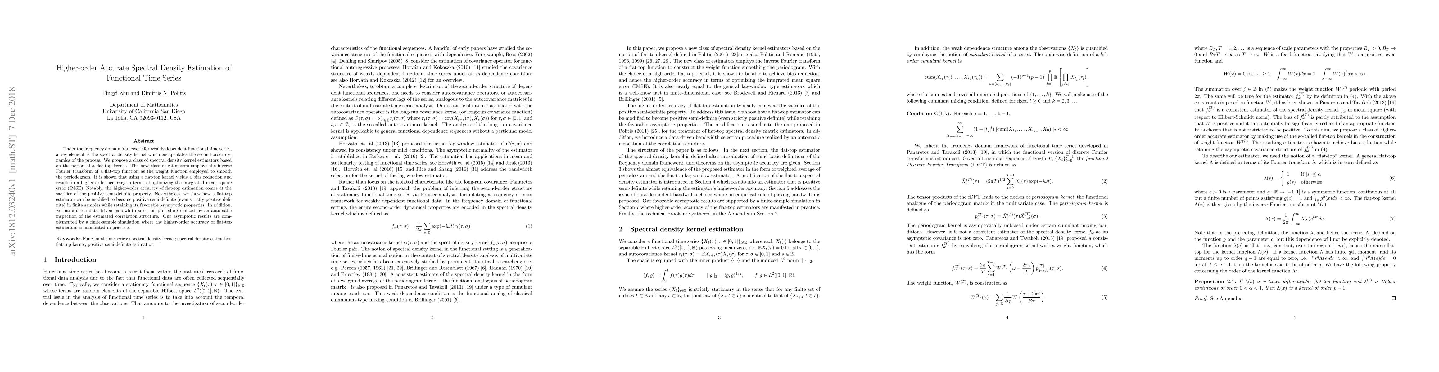 Under the frequency domain framework for weakly dependent functional time series, a key element is the spectral density kernel which encapsulates the second-order dynamics of the process. We propose a class of spectral density kernel estimators based on the notion of a flat-top kernel. The new class of estimators employs the inverse Fourier transform of a flat-top function as the weight function employed to smooth the periodogram. It is shown that using a flat-top kernel yields a bias reduction and results in a higher-order accuracy in terms of optimizing the integrated mean square error (IMSE). Notably, the higher-order accuracy of flat-top estimation comes at the sacrifice of the positive semi-definite property. Nevertheless, we show how a flat-top estimator can be modified to become positive semi-definite (even strictly positive definite) in finite samples while retaining its favorable asymptotic properties. In addition, we introduce a data-driven bandwidth selection procedure realized by an automatic inspection of the estimated correlation structure. Our asymptotic results are complemented by a finite-sample simulation where the higher-order accuracy of flat-top estimators is manifested in practice.