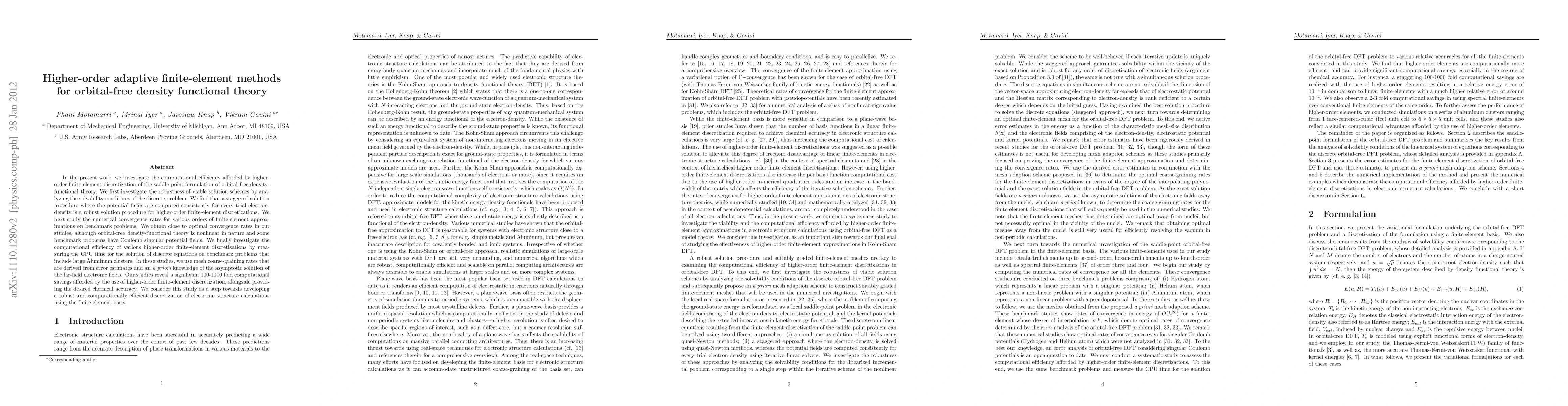 This paper explores the computational efficiency of higher-order adaptive finite-element methods for orbital-free density functional theory, demonstrating robust solution procedures and achieving close to optimal convergence rates. The study reveals significant computational savings of 100-1000 times for large Aluminum clusters, marking a promising advancement in efficient electronic structure calculations.