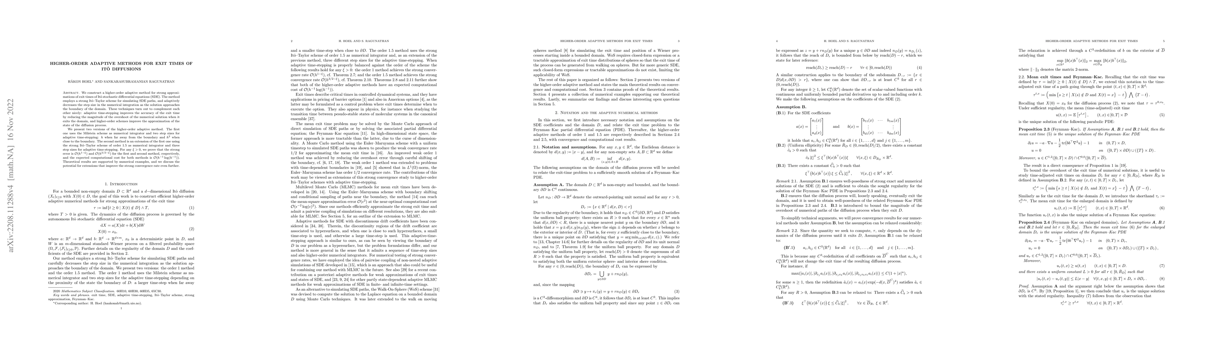 This paper develops higher-order adaptive methods for approximating exit times of Itô diffusions, employing a strong Itô-Taylor scheme and adaptive time-stepping to enhance accuracy. The methods achieve strong error bounds of $\mathcal{O}(h^{1-\xi})$ and $\mathcal{O}(h^{3/2-\xi})$, respectively, and have computational costs of $\mathcal{O}(h^{-1} \log(h^{-1}))$.