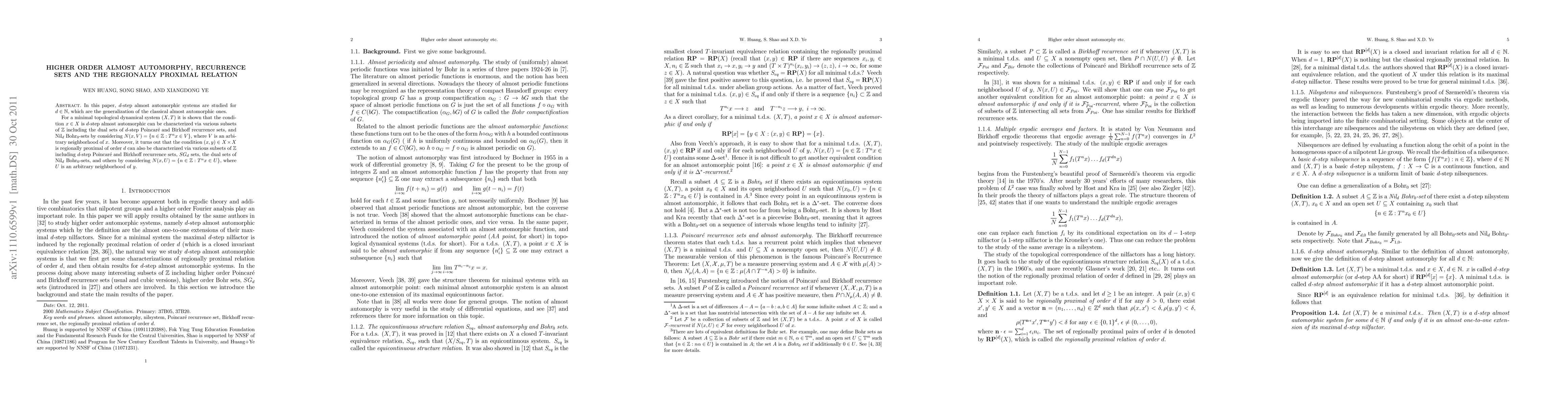 This paper studies $d$-step almost automorphic systems, generalizing classical almost automorphy, and shows their characterization via various subsets of $\mathbb{Z}$. It also explores the regionally proximal relation of order $d$ in minimal topological dynamical systems, characterized by subsets of $\mathbb{Z}$ including recurrence sets and Nil$_d$ Bohr$_0$-sets.
