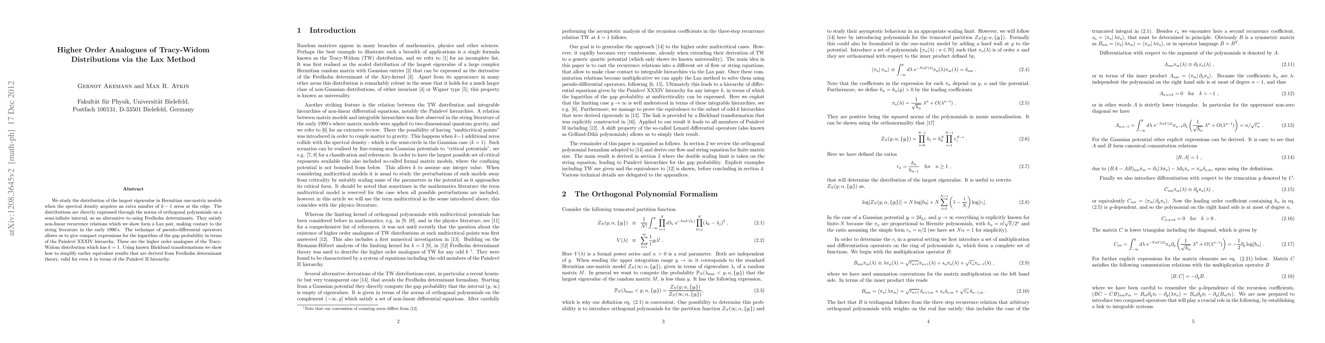 This paper investigates higher order analogues of Tracy-Widom distributions for Hermitian one-matrix models using the Lax method. It expresses these distributions via orthogonal polynomials and pseudo-differential operators, linking them to the Painlevé XXXIV hierarchy and simplifying earlier results via Backlund transformations.