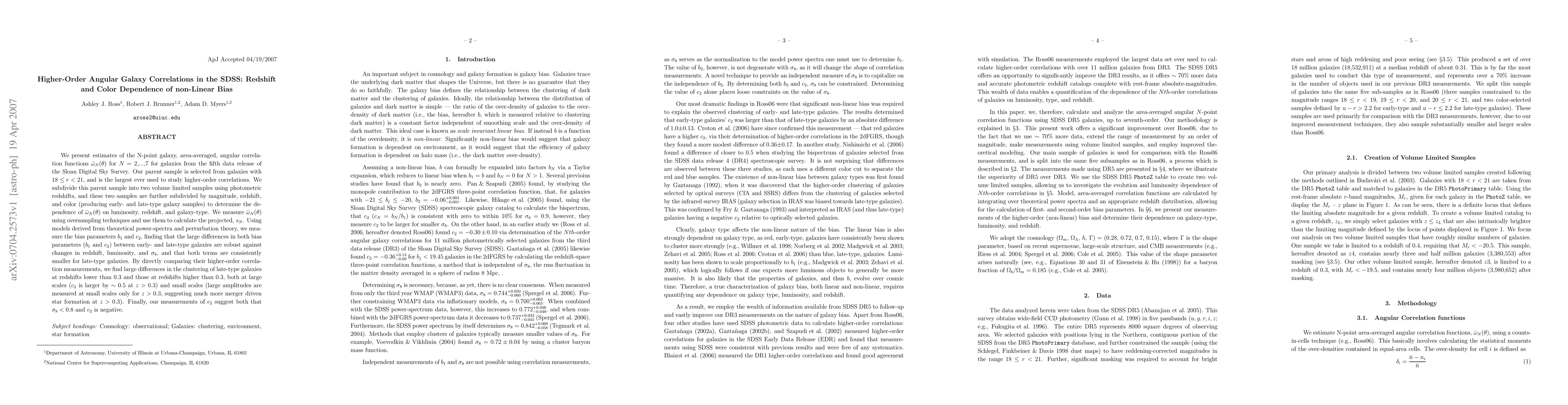 We present estimates of the N-point galaxy, area-averaged, angular correlation functions $\bar{\omega}_{N}$($\theta$) for $N$ = 2,...,7 for galaxies from the fifth data release of the Sloan Digital Sky Survey. Our parent sample is selected from galaxies with $18 \leq r < 21$, and is the largest ever used to study higher-order correlations. We subdivide this parent sample into two volume limited samples using photometric redshifts, and these two samples are further subdivided by magnitude, redshift, and color (producing early- and late-type galaxy samples) to determine the dependence of $\bar{\omega}_{N}$($\theta$) on luminosity, redshift, and galaxy-type. We measure $\bar{\omega}_{N}$($\theta$) using oversampling techniques and use them to calculate the projected, $s_{N}$. Using models derived from theoretical power-spectra and perturbation theory, we measure the bias parameters $b_1$ and $c_2$, finding that the large differences in both bias parameters ($b_1$ and $c_2$) between early- and late-type galaxies are robust against changes in redshift, luminosity, and $\sigma_8$, and that both terms are consistently smaller for late-type galaxies. By directly comparing their higher-order correlation measurements, we find large differences in the clustering of late-type galaxies at redshifts lower than 0.3 and those at redshifts higher than 0.3, both at large scales ($c_2$ is larger by $\sim0.5$ at $z > 0.3$) and small scales (large amplitudes are measured at small scales only for $z > 0.3$, suggesting much more merger driven star formation at $z > 0.3$). Finally, our measurements of $c_2$ suggest both that $\sigma_8 < 0.8$ and $c_2$ is negative.