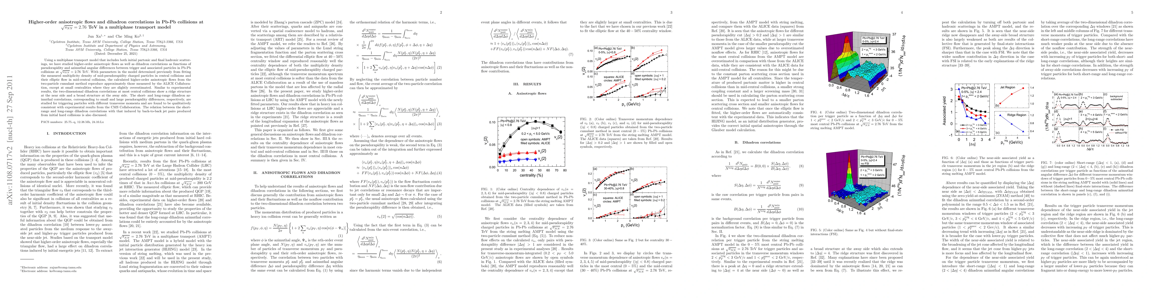 Using a multiphase transport model that includes both initial partonic and final hadronic scatterings, we have studied higher-order anisotropic flows as well as dihadron correlations as functions of pseudorapidity and azimuthal angular differences between trigger and associated particles in Pb-Pb collisions at $\sqrt{s_{NN}}=2.76$ TeV. With parameters in the model determined previously from fitting the measured multiplicity density of mid-pseudorapidity charged particles in central collisions and their elliptic flow in mid-central collisions, the calculated higher-order anisotropic flows from the two-particle cumulant method reproduce approximately those measured by the ALICE Collaboration, except at small centralities where they are slightly overestimated. Similar to experimental results, the two-dimensional dihadron correlations at most central collisions show a ridge structure at the near side and a broad structure at the away side. The short- and long-range dihadron azimuthal correlations, corresponding to small and large pseudorapidity differences, respectively, are studied for triggering particles with different transverse momenta and are found to be qualitatively consistent with experimental results from the CMS Collaboration. The relation between the short-range and long-range dihadron correlations with that induced by back-to-back jet pairs produced from initial hard collisions is also discussed.