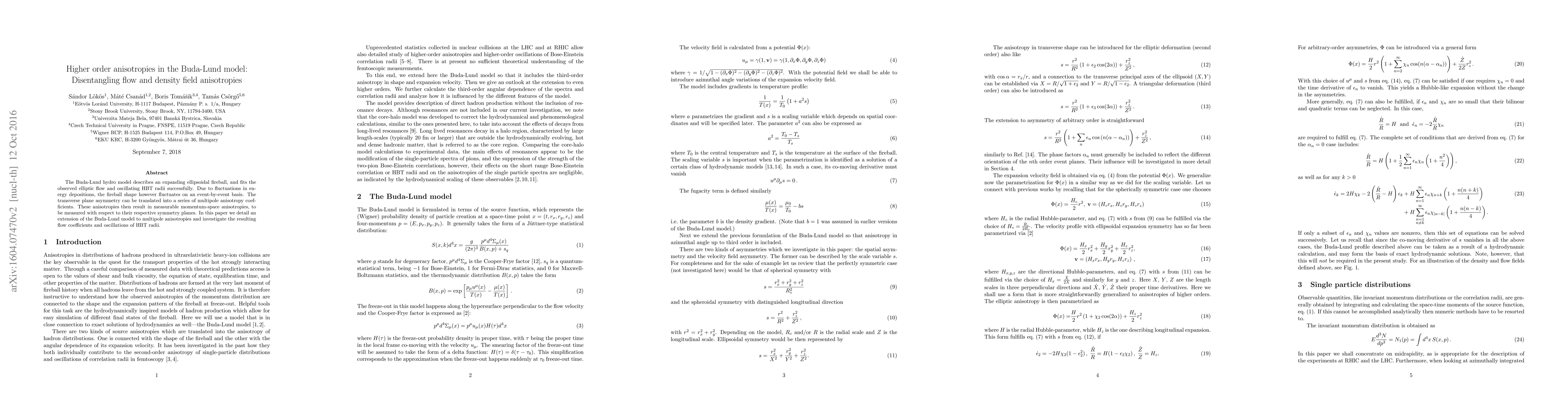 The Buda-Lund hydro model describes an expanding ellipsoidal fireball, and fits the observed elliptic flow and oscillating HBT radii successfully. Due to fluctuations in energy depositions, the fireball shape however fluctuates on an event-by-event basis. The transverse plane asymmetry can be translated into a series of multipole anisotropy coefficients. These anisotropies then result in measurable momentum-space anisotropies, to be measured with respect to their respective symmetry planes. In this paper we detail an extension of the Buda-Lund model to multipole anisotropies and investigate the resulting flow coefficients and oscillations of HBT radii.
