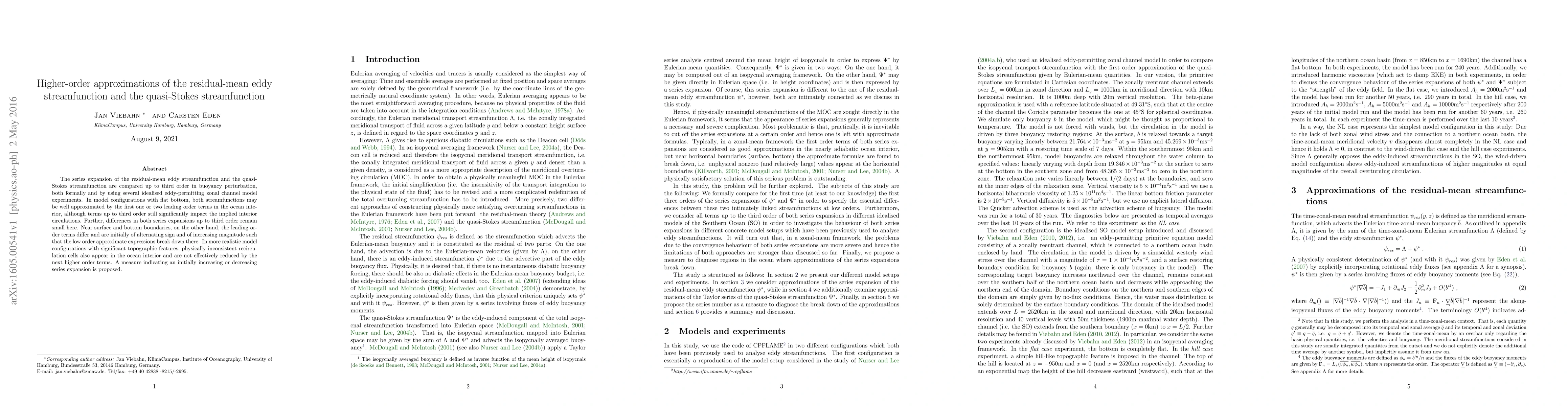 The series expansion of the residual-mean eddy streamfunction and the quasi-Stokes streamfunction are compared up to third order in buoyancy perturbation, both formally and by using several idealised eddy-permitting zonal channel model experiments. In model configurations with flat bottom, both streamfunctions may be well approximated by the first one or two leading order terms in the ocean interior, although terms up to third order still significantly impact the implied interior circulations. Further, differences in both series expansions up to third order remain small here. Near surface and bottom boundaries, on the other hand, the leading order terms differ and are initially of alternating sign and of increasing magnitude such that the low order approximate expressions break down there. In more realistic model configurations with significant topographic features, physically inconsistent recirculation cells also appear in the ocean interior and are not effectively reduced by the next higher order terms. A measure indicating an initially increasing or decreasing series expansion is proposed.