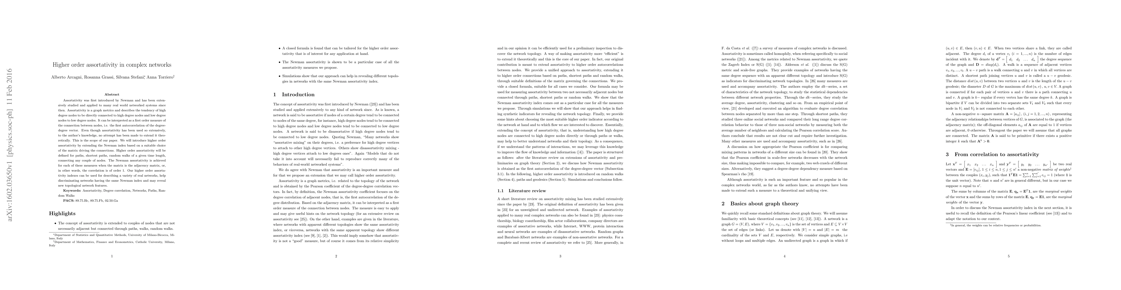 Assortativity was first introduced by Newman and has been extensively studied and applied to many real world networked systems since then. Assortativity is a graph metrics and describes the tendency of high degree nodes to be directly connected to high degree nodes and low degree nodes to low degree nodes. It can be interpreted as a first order measure of the connection between nodes, i.e. the first autocorrelation of the degree-degree vector. Even though assortativity has been used so extensively, to the author's knowledge, no attempt has been made to extend it theoretically. This is the scope of our paper. We will introduce higher order assortativity by extending the Newman index based on a suitable choice of the matrix driving the connections. Higher order assortativity will be defined for paths, shortest paths, random walks of a given time length, connecting any couple of nodes. The Newman assortativity is achieved for each of these measures when the matrix is the adjacency matrix, or, in other words, the correlation is of order 1. Our higher order assortativity indexes can be used for describing a variety of real networks, help discriminating networks having the same Newman index and may reveal new topological network features.