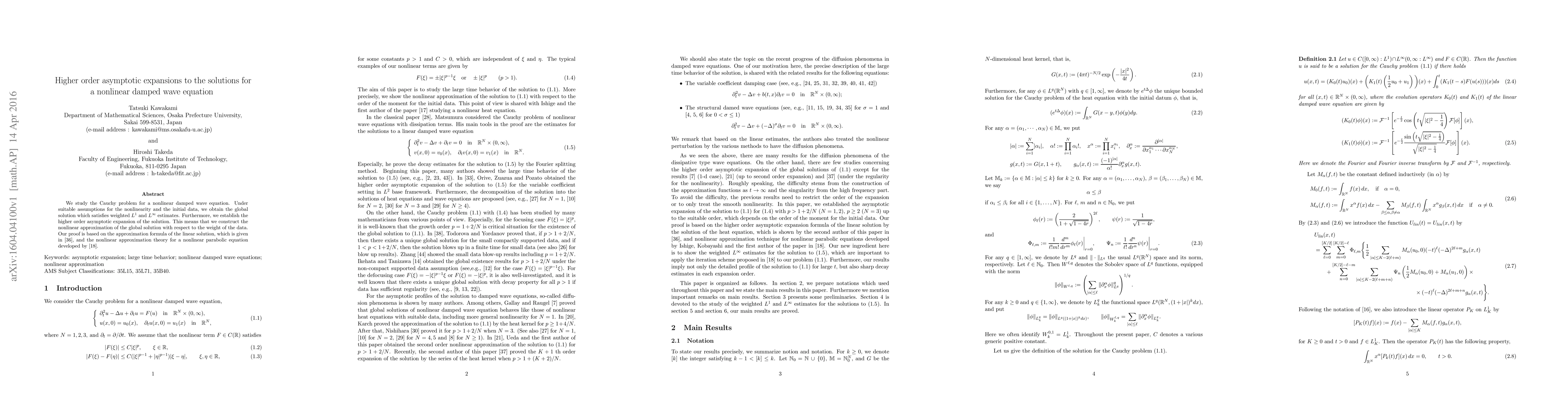 This paper investigates the Cauchy problem for a nonlinear damped wave equation, deriving global solutions that satisfy weighted $L^1$ and $L^\infty$ estimates. It also establishes higher order asymptotic expansions for the solution, providing a nonlinear approximation based on linear solution approximations and nonlinear parabolic equation theory.