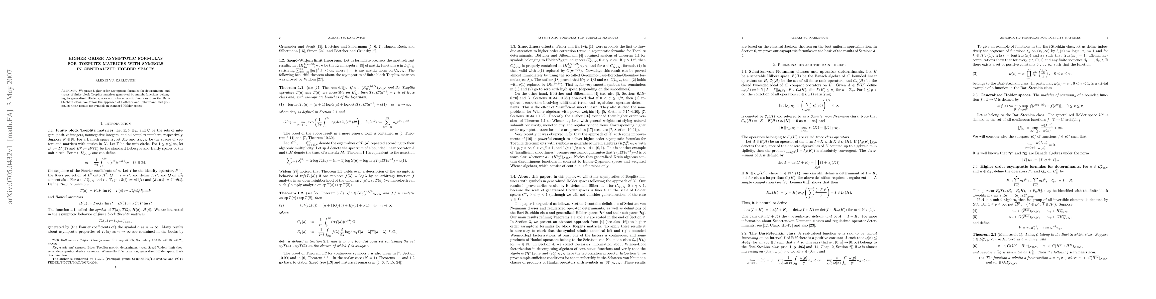 This paper proves higher order asymptotic formulas for determinants and traces of finite block Toeplitz matrices with symbols in generalized H\"older spaces, extending the approach of B\"ottcher and Silbermann from standard H\"older spaces to the generalized case.